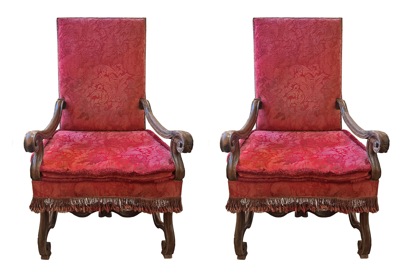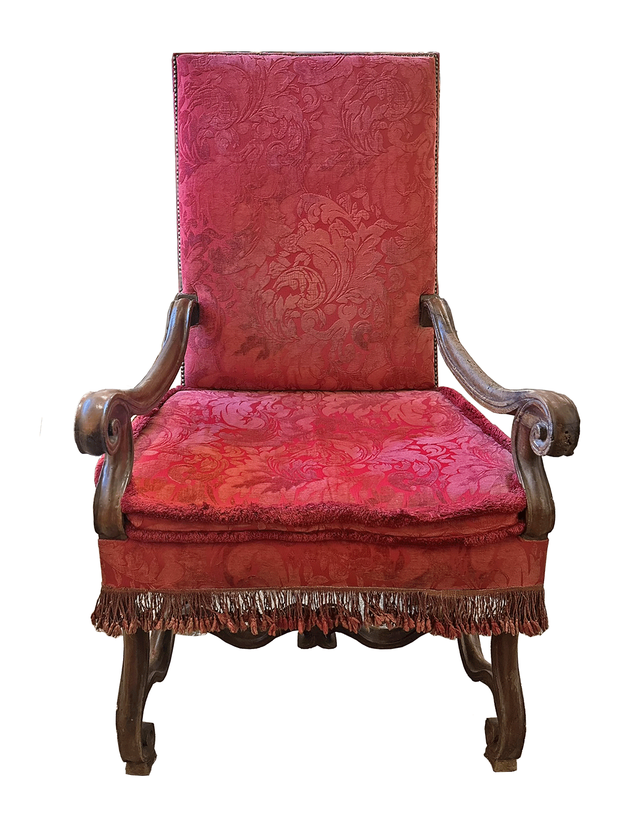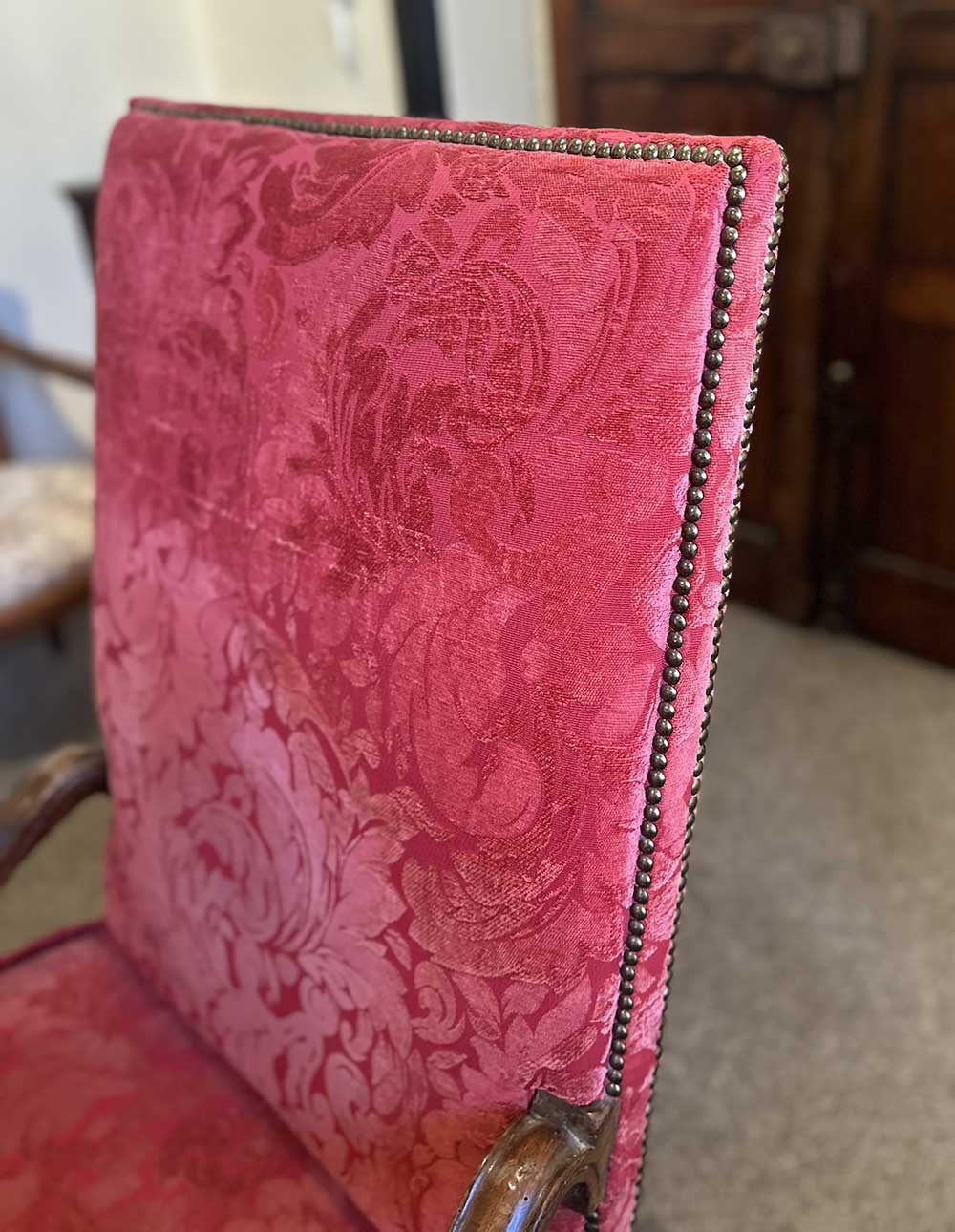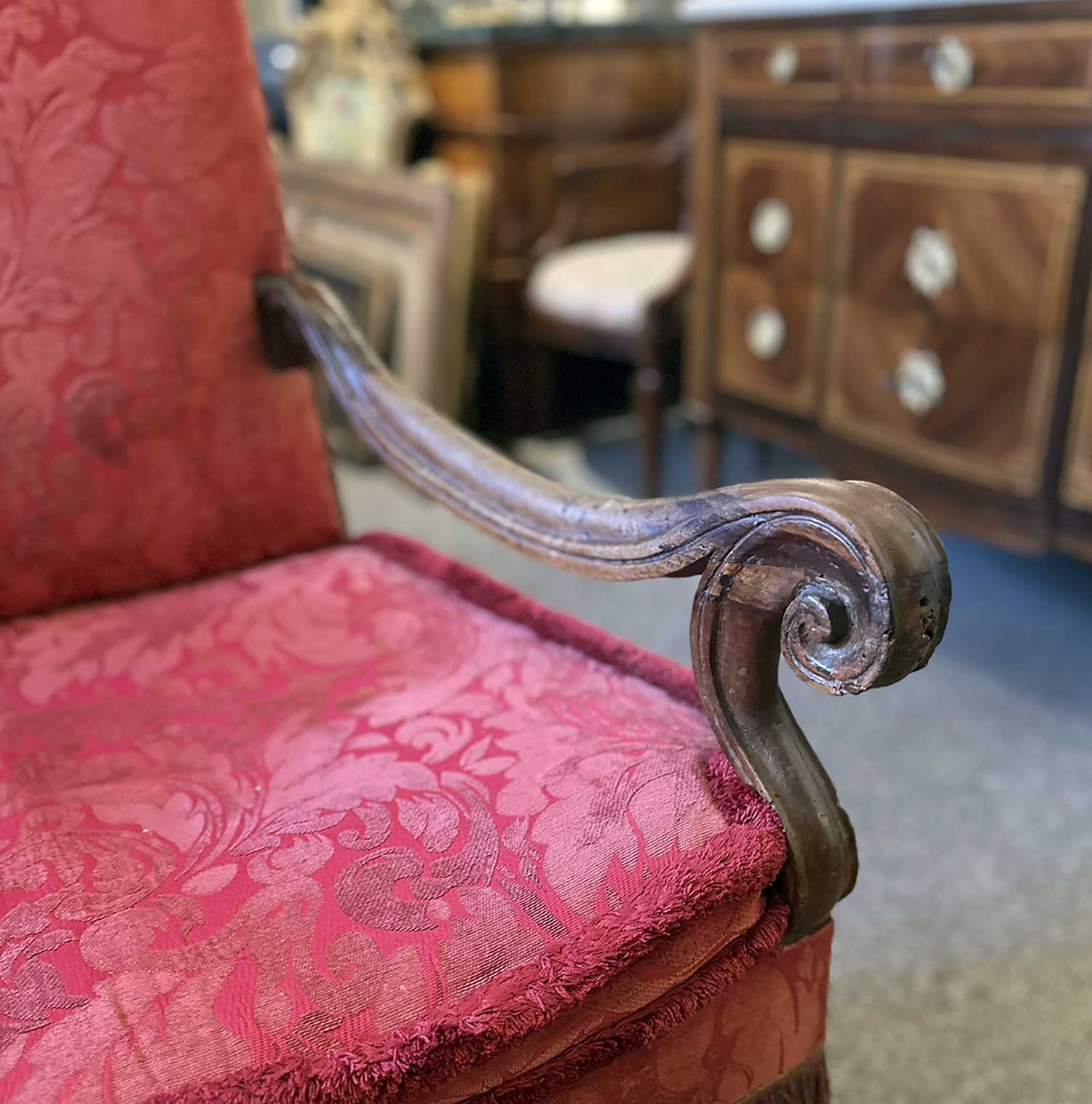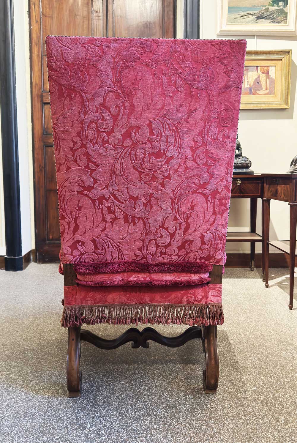 La struttura, finemente intagliata in legno di noce, presenta i caratteristici braccioli mossi a ricciolo e gambe sagomate, tipici della tradizione ligure. Le sedute e gli schienali sono rivestiti in damasco rosso con bordura a chiodini e passamaneria.