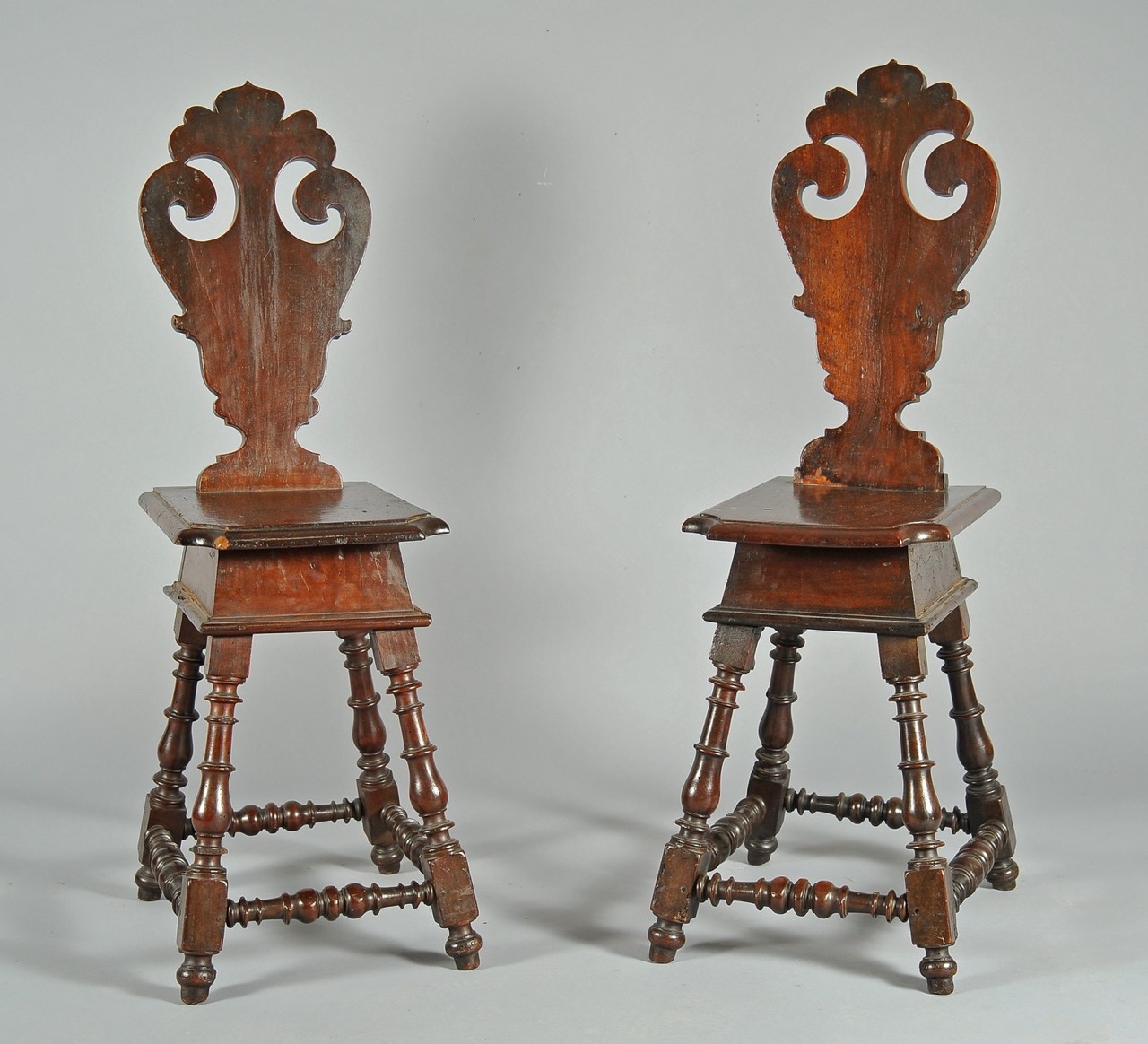Coppia di sgabelli con schienale in noce intagliato, Toscana secolo XVII