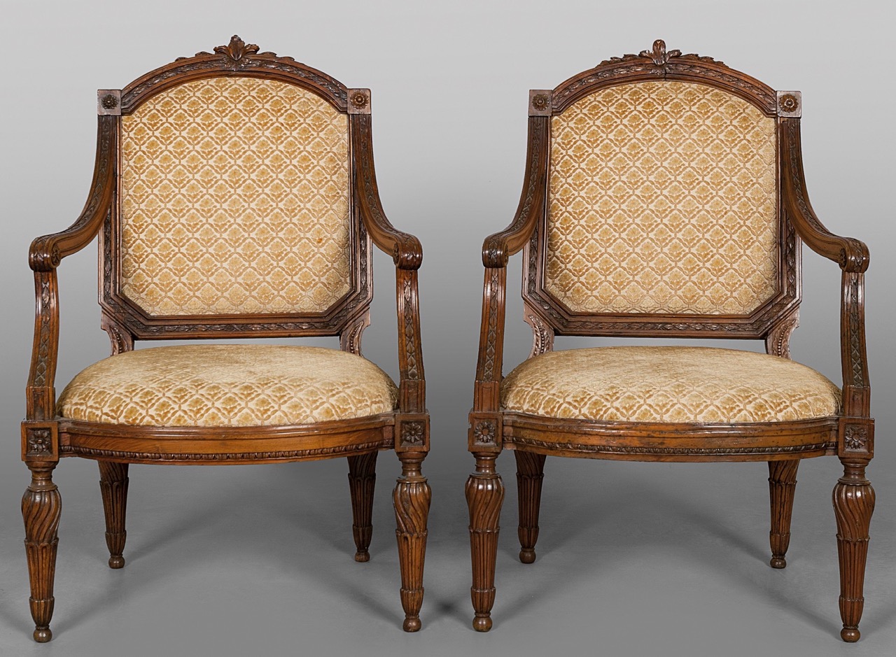 Coppia di poltrone Luigi XVI in noce finemente intagliato, gambe a tortiglione, Genova secolo XVIII