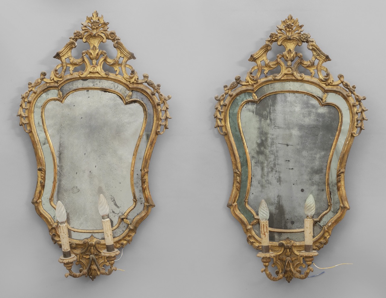 Coppia di specchiere Luigi XV in legno intagliato e dorato con controspecchi, due bracetti portaluce – Venezia secolo XVIII