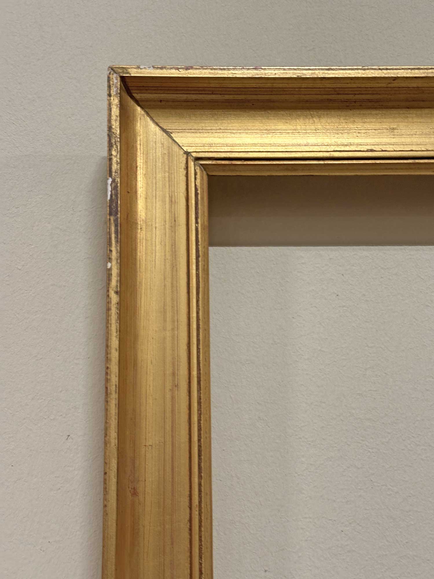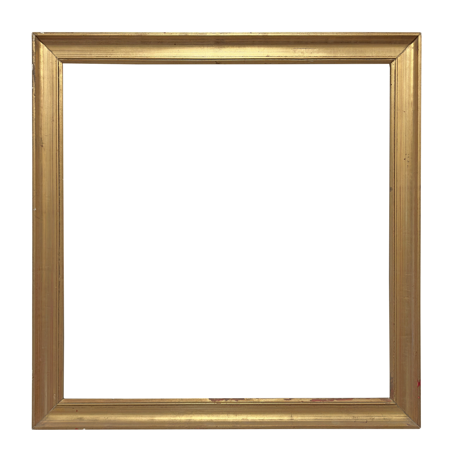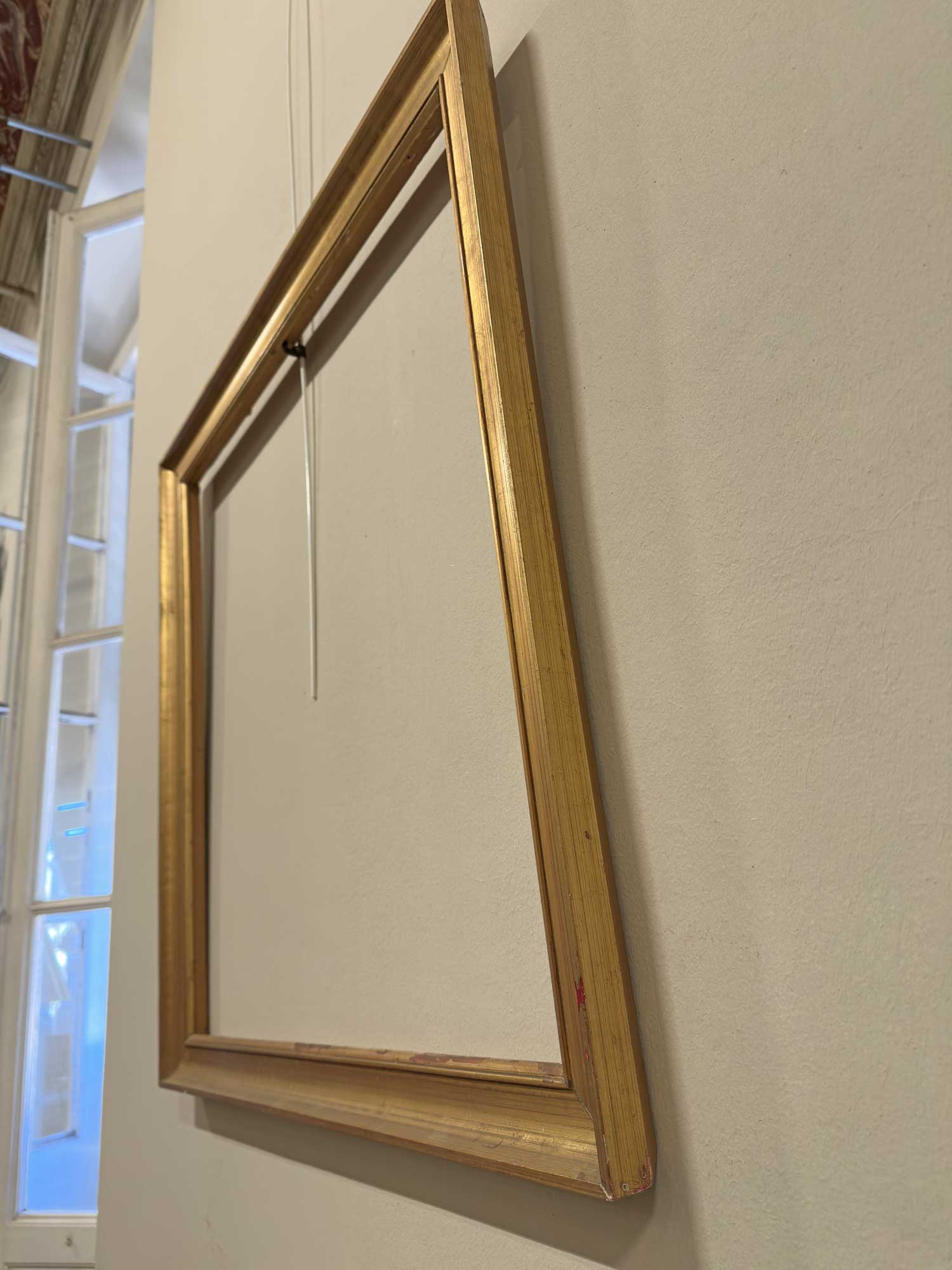 Cornice quadrata in legno dorato a guazzo, con profilo liscio e lineare e battuta interna modanata. Esempio sobrio ed elegante della produzione italiana ottocentesca.