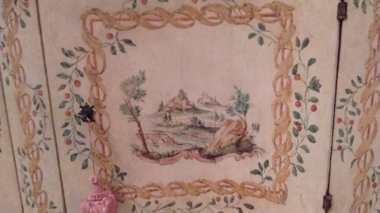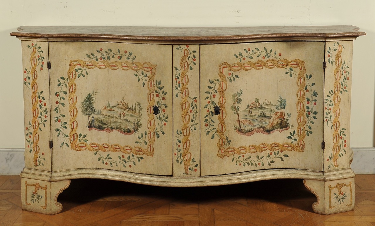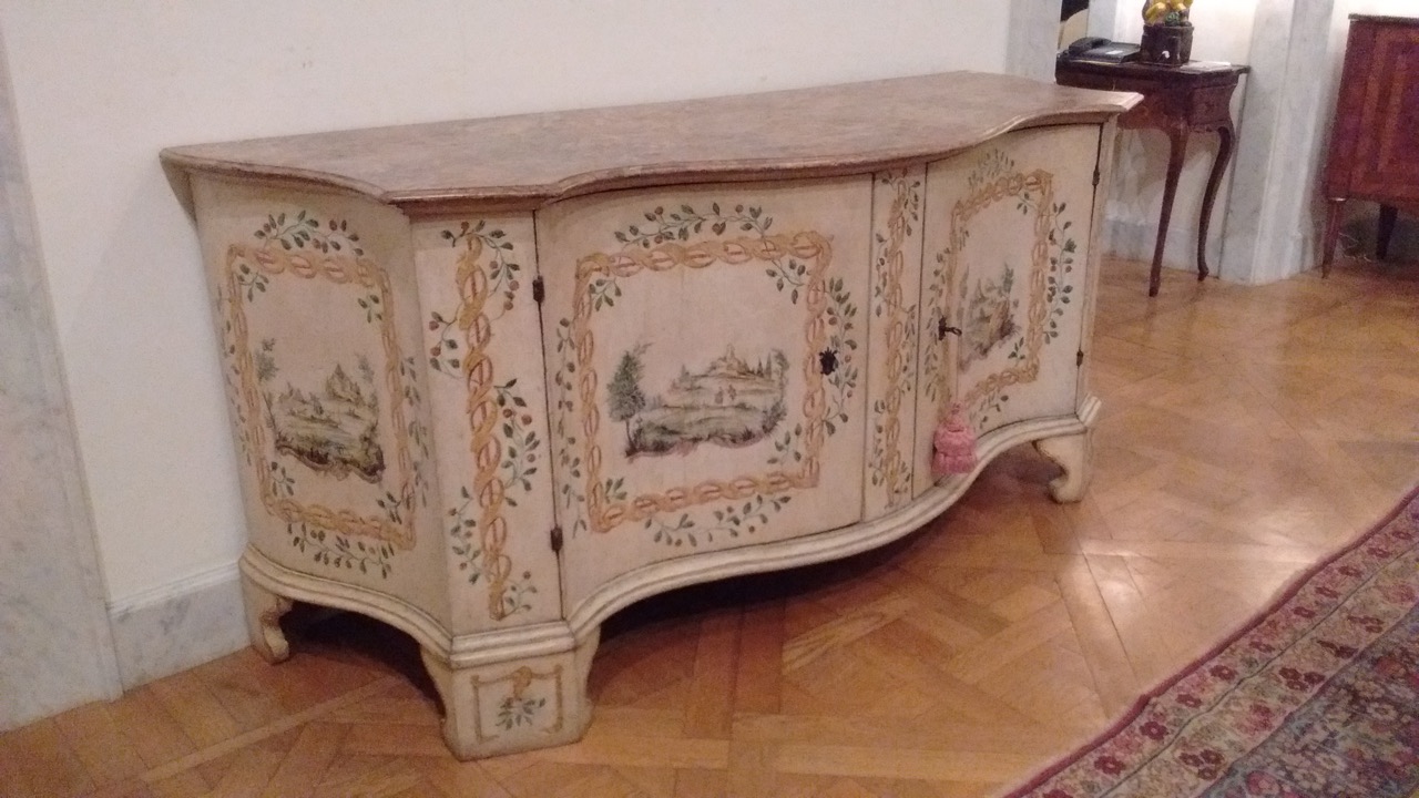 Credenza Luigi XV laccata a fondo crema con decorazioni di paesaggi, Genova prima metà secolo XVIII