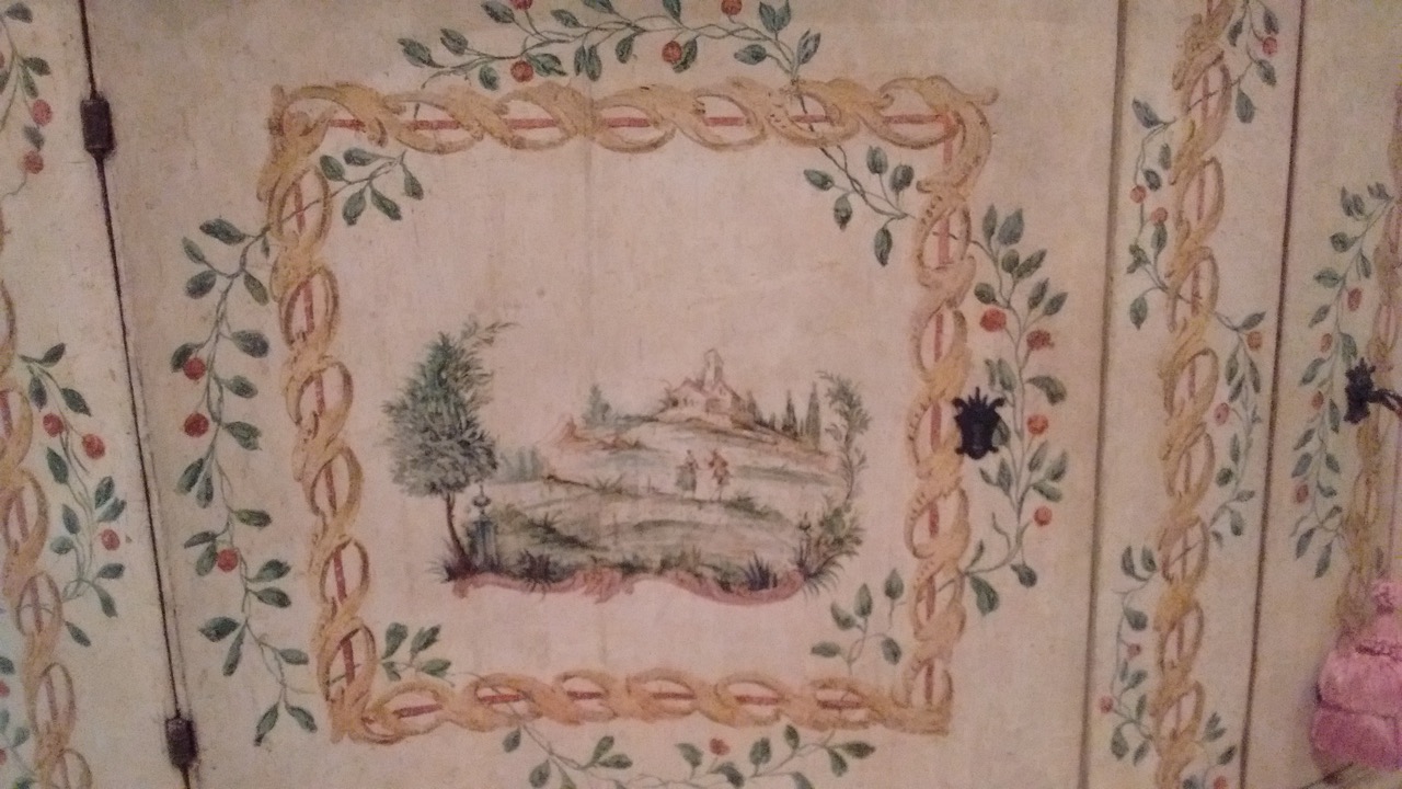 A due sportelli laccata a fondo crema con decorazioni di paesaggi animati da coppie di figure. Piano dipintio ad imitazione del marmo Fior di pesco