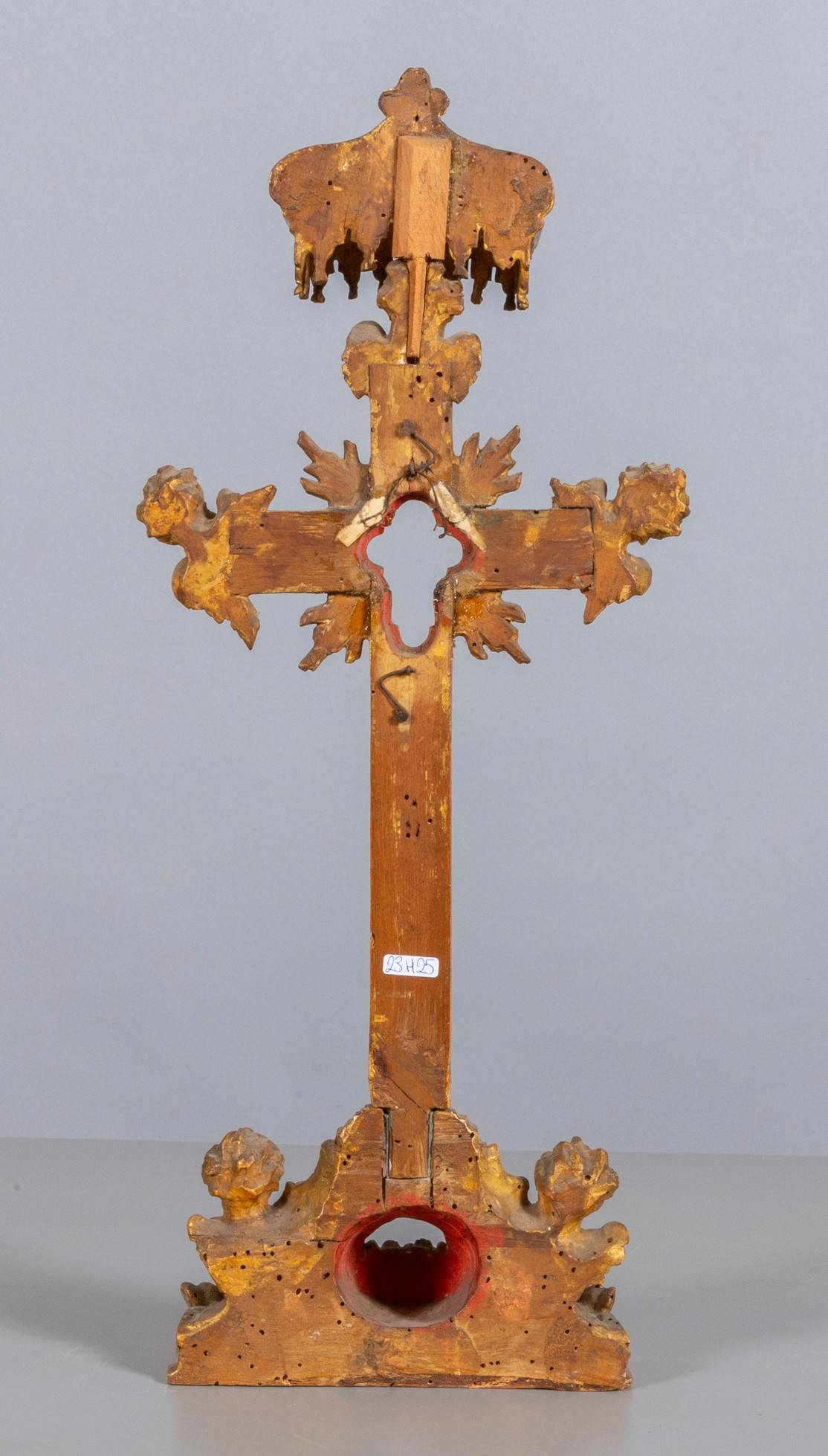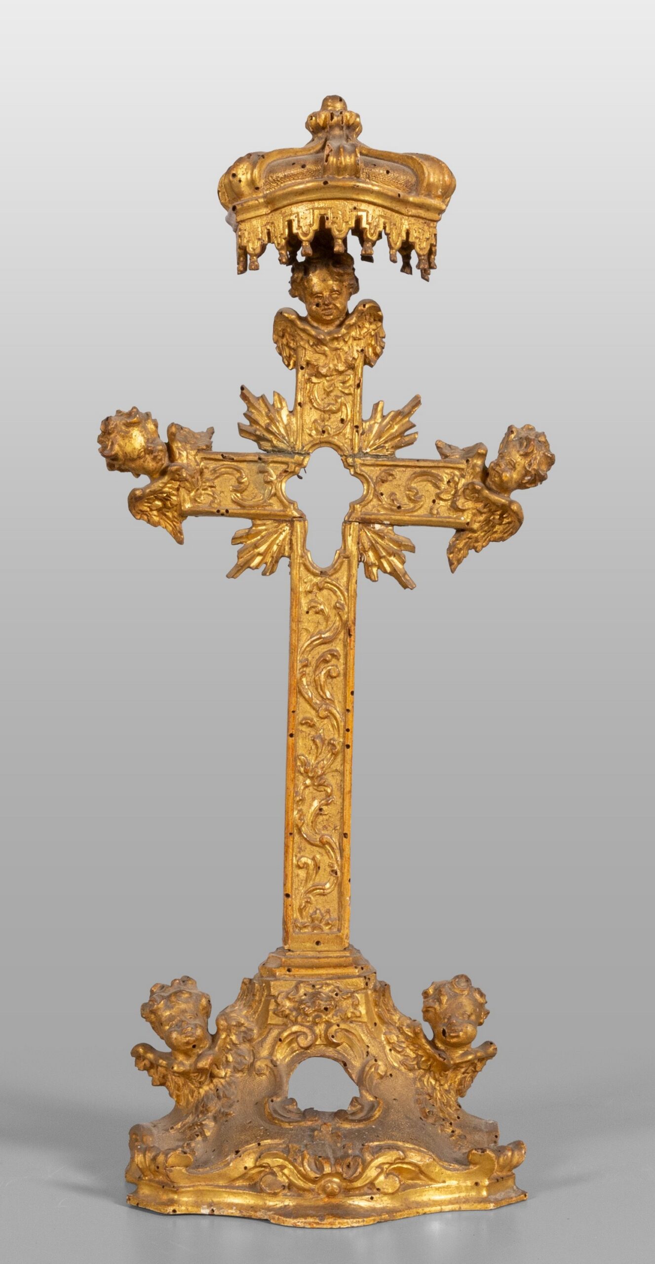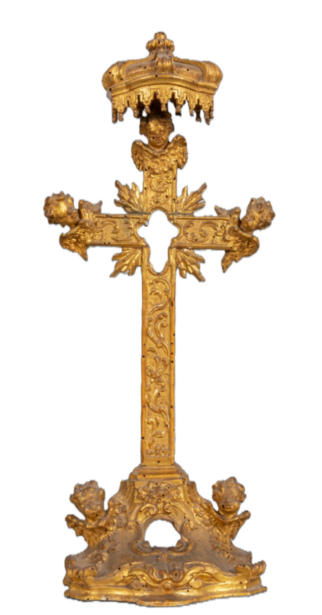 Croce portareliquie in legno finemente intagliato poggiante su basamento con testine di Angeli, Roma I metà secolo XVIII