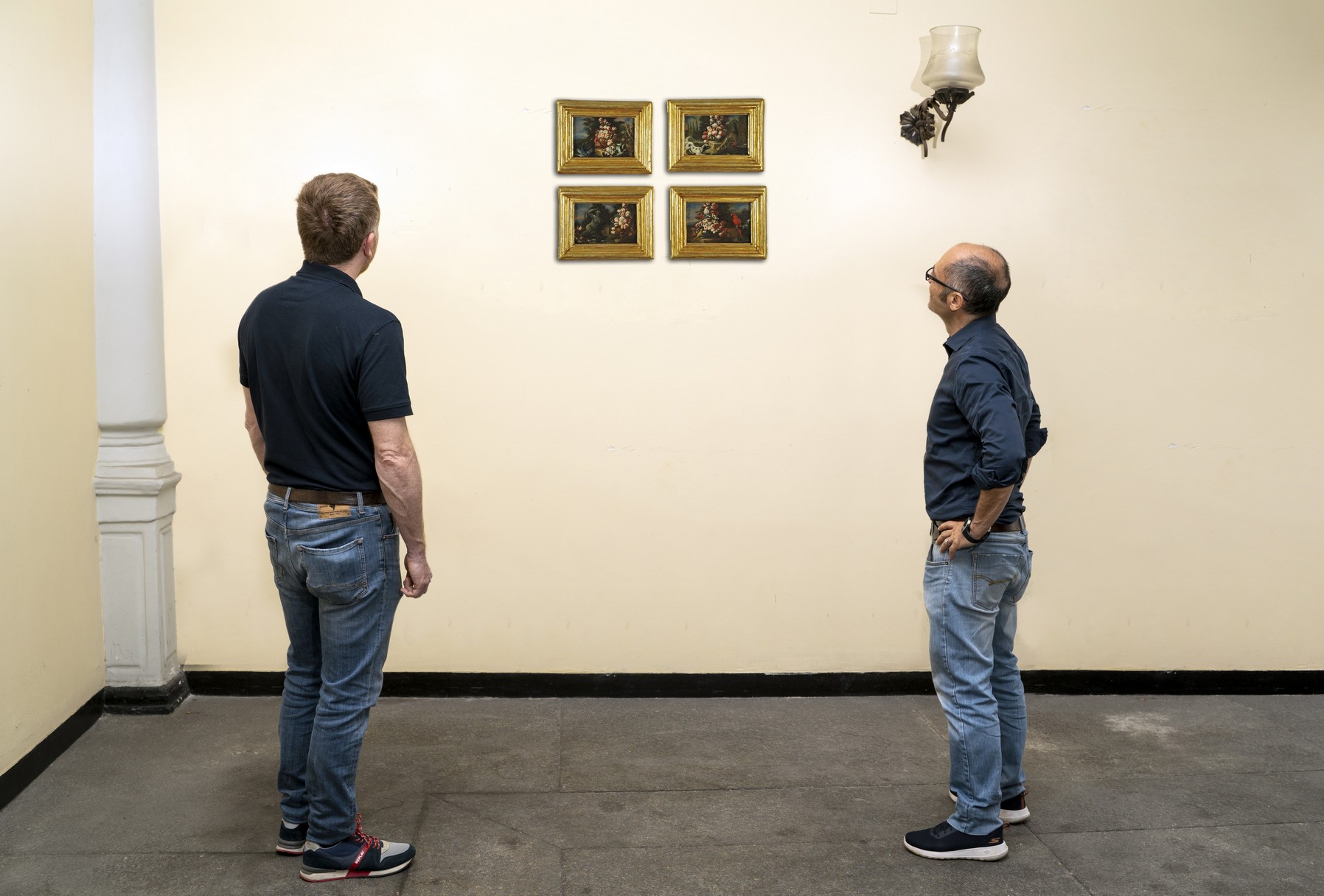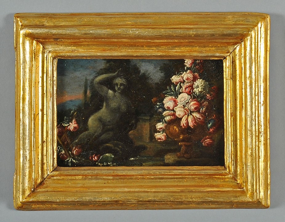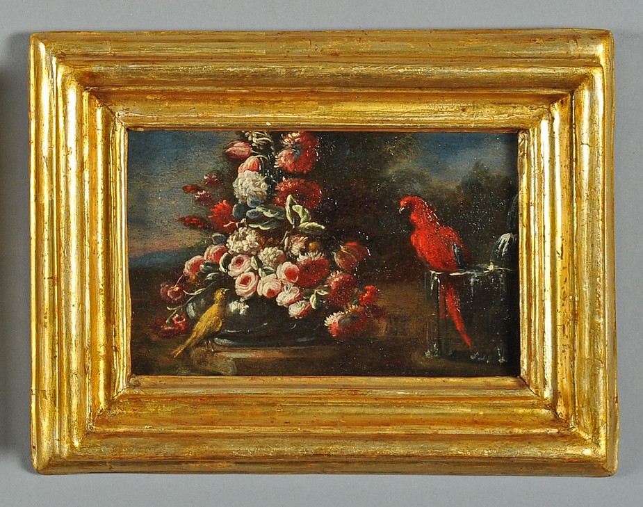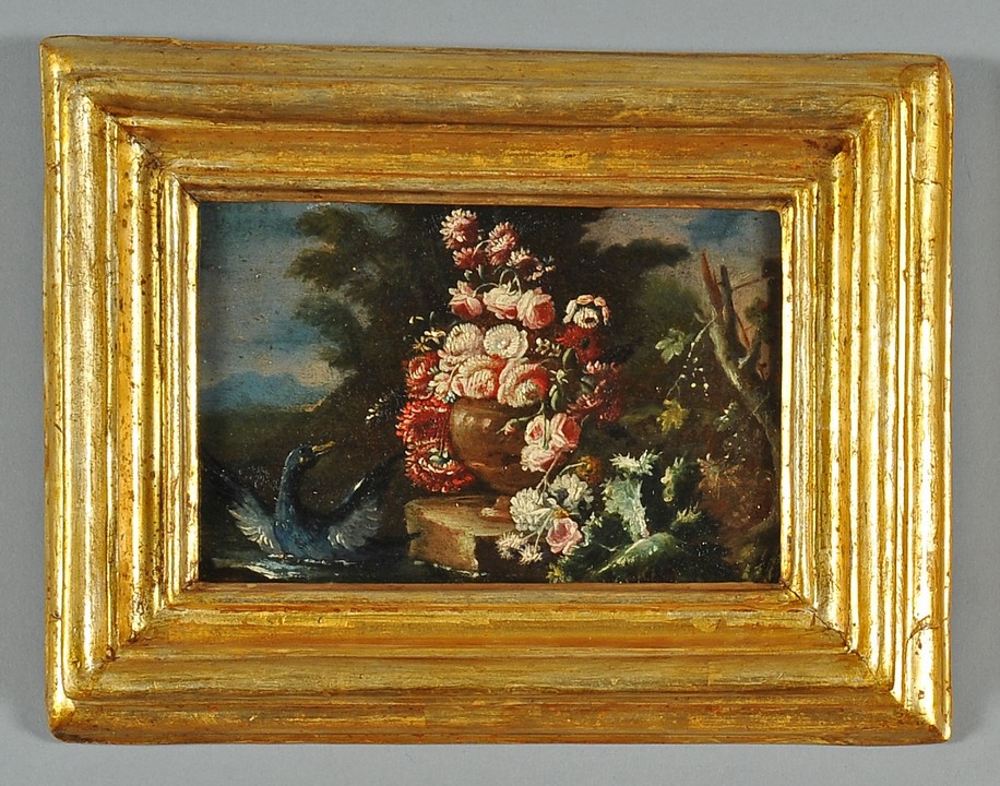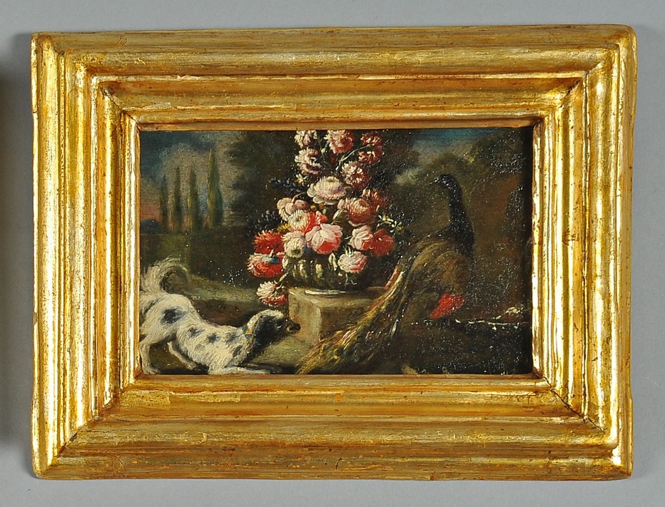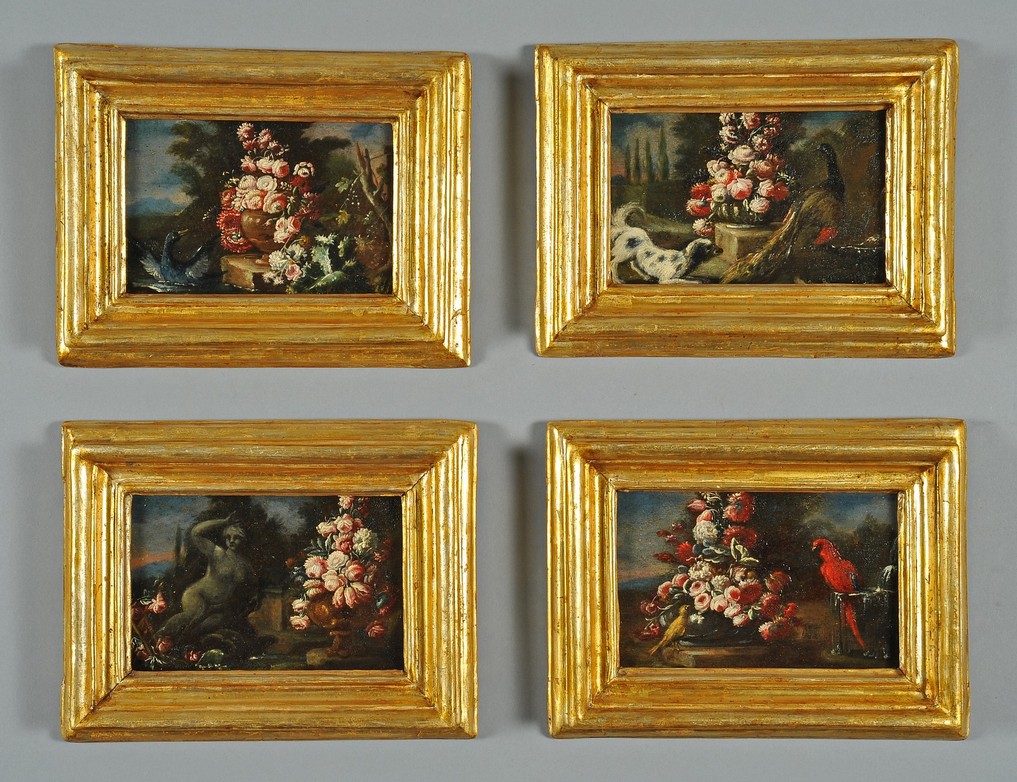De Caro Baldassarre (Napoli 1689 1750) quattro minuti oli su tavola raffiguranti Vasi di fiori e animali da cortile