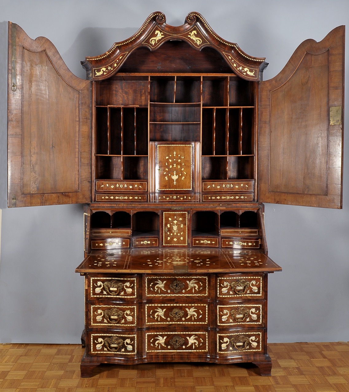 Elegante struttura mossa, raffinata intarsia con elementi figurativi e motivi vegetali.