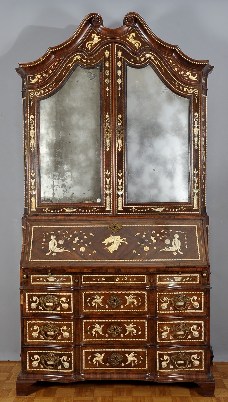 Parte inferiore del trumeau a tre cassetti più tre e parte superiore a due sportelli con specchi.