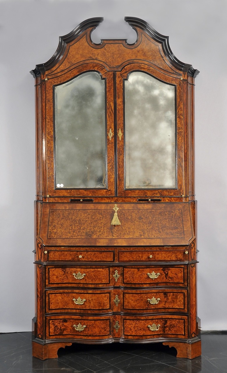 Doppio corpo o trumeau Luigi XIV lastronato in radica di tuja e filettato in legno ebanizzato, Genova inizi secolo XVIII