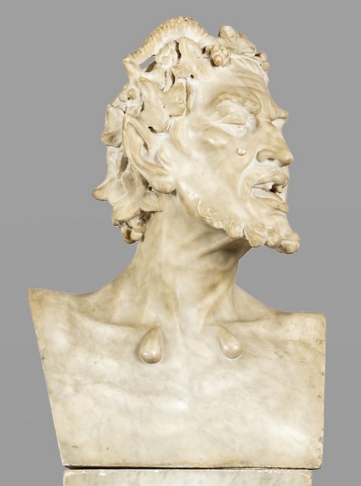 Scultura in marmo statuario raffigurante il dio Pan, una divinità non olimpica della mitologia greca dall’aspetto di un satiro, legata alle selve, alla pastorizia e alla natura. La statua presenta il busto sormontato dal volto del dio, reso con particolare maestria, e caratterizzato dalle iconiche corna e tratti caprini, simboli di potenza e connessione con il mondo naturale.