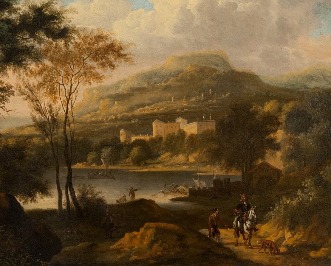 De Moucheron si formò ad Amsterdam, ma viaggiò in Italia dove assimilò lo stile dei paesaggisti classici come Claude Lorrain e Salvator Rosa. Nei suoi paesaggi, spesso animati da figure dipinte da altri artisti (in questo caso forse da Adriaen van de Velde o Johannes Lingelbach, suoi frequenti collaboratori), si ritrovano vedute armoniose e bilanciate, in cui l’elemento umano si fonde con la grandiosità della natura.