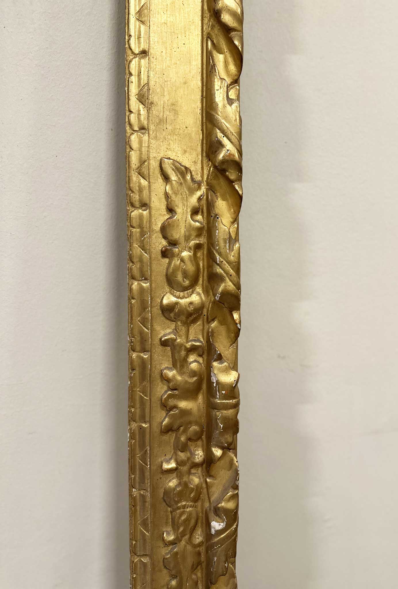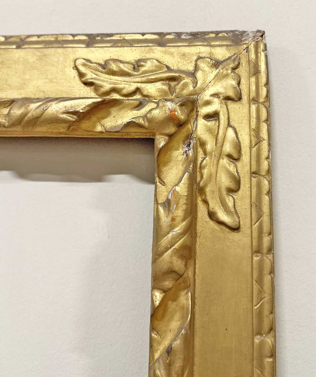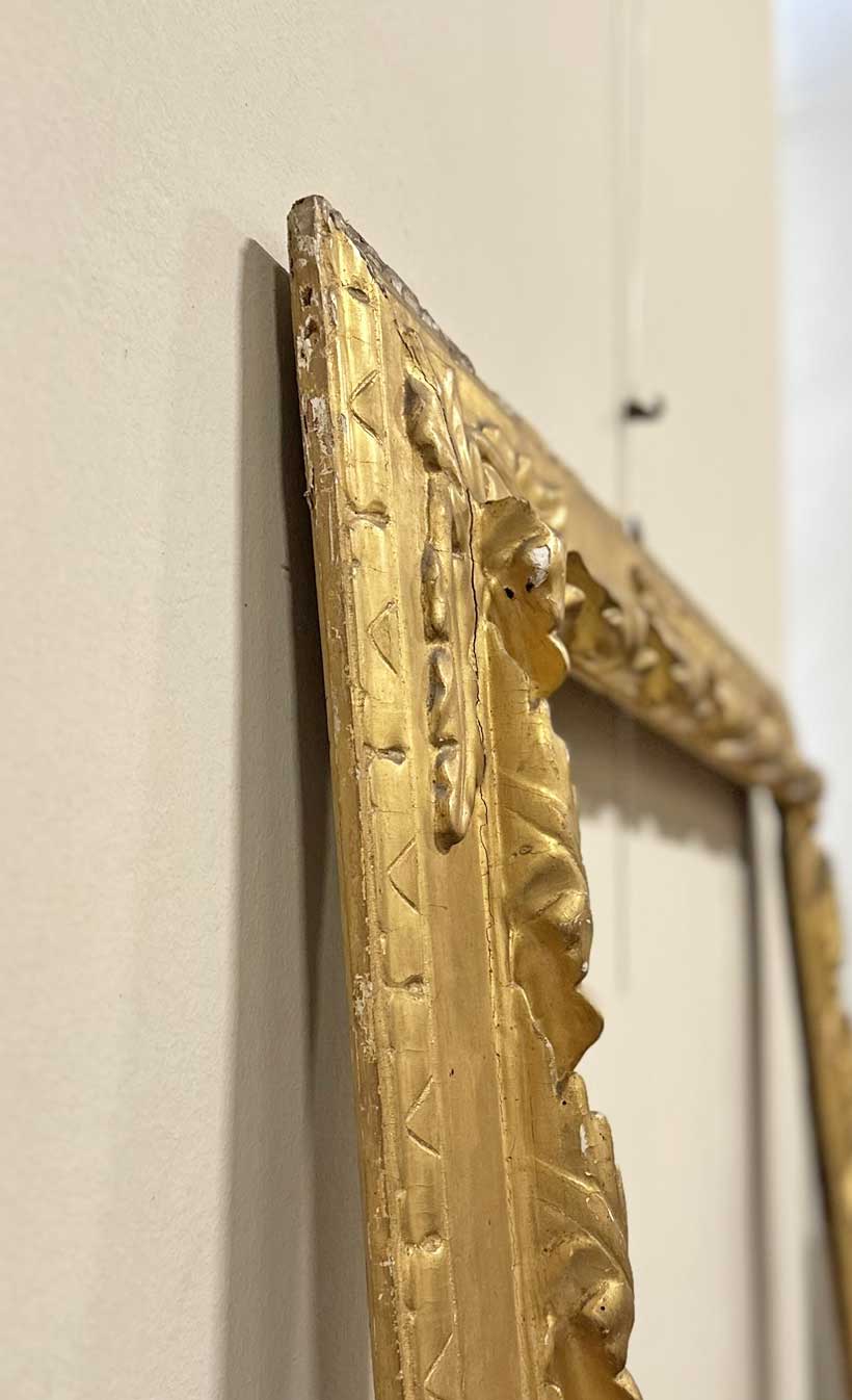 La cornice, di forma rettangolare, presenta una fascia riccamente decorata con motivi a foglie e riserve centrali a tema vegetale. Il profilo aggettante conferisce forza e solennità all’insieme, rendendola adatta a ospitare opere di grande importanza
