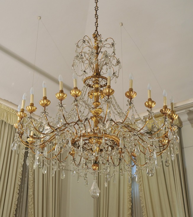 Lampadario Luigi XVI a 24 luci in legno finemente intagliato e dorato, metallo e cristallo molato, Genova fine secolo XVIII