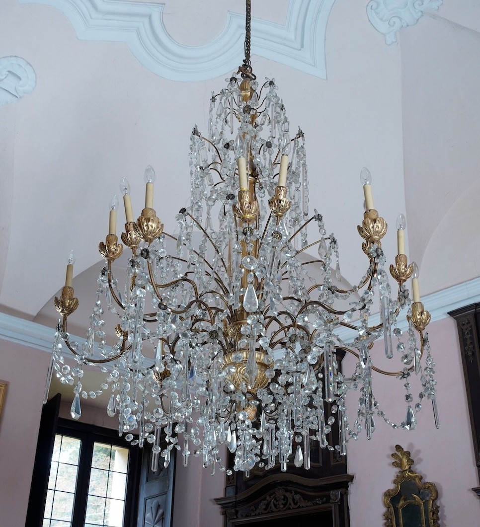 Grande lampadario Luigi XVI in legno intagliato e dorato, pendenti in vetro molato, Genova secolo XVIII