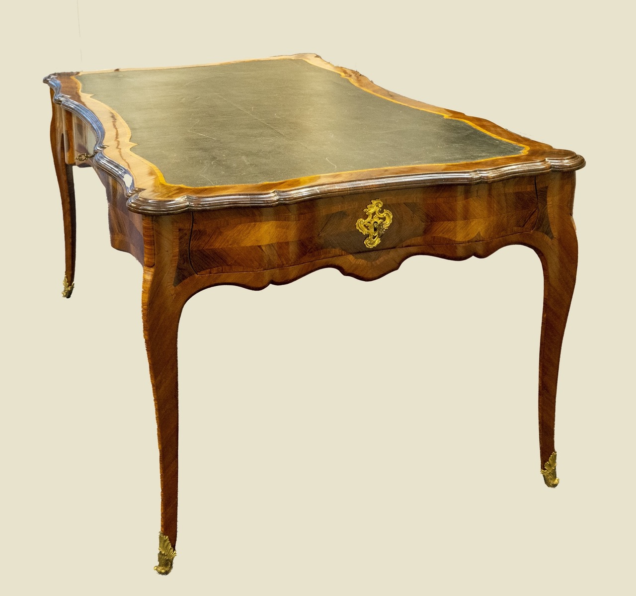 Con un cassetto per lato, lastronata in palissandro a lisca di pesce e filettata in bois de rose, bocchette e piedini in bronzo dorato e cesellato; piano in pelle. Straordinaria per qualità e dimensioni: scrittoio di alta committenza.