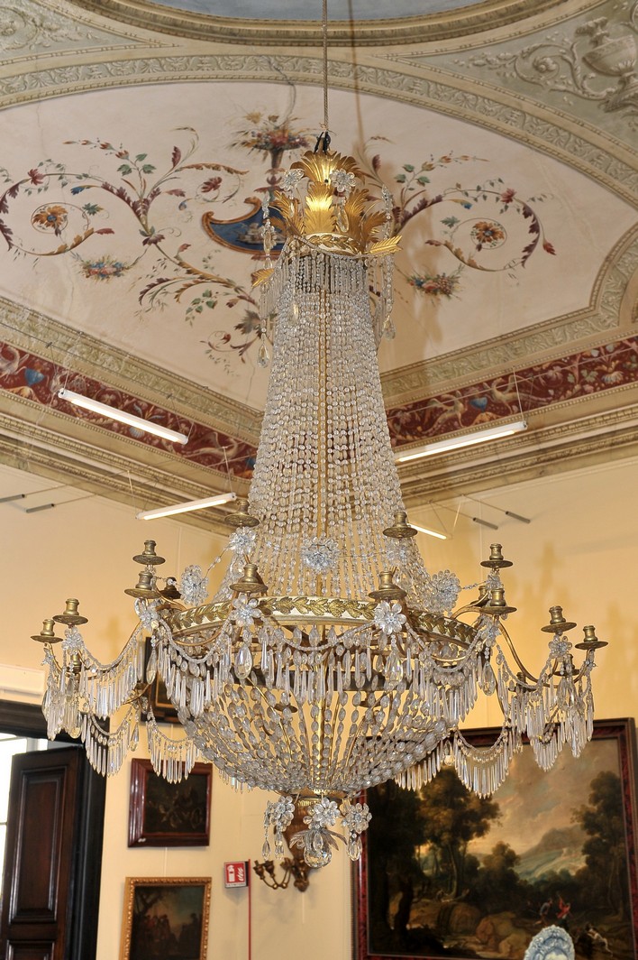 In metallo lamierino dorato e cristallo molato, luci disposte su due ordini. Parte superiore a forma di mongolfiera e decorata a palmette dorate. diametro