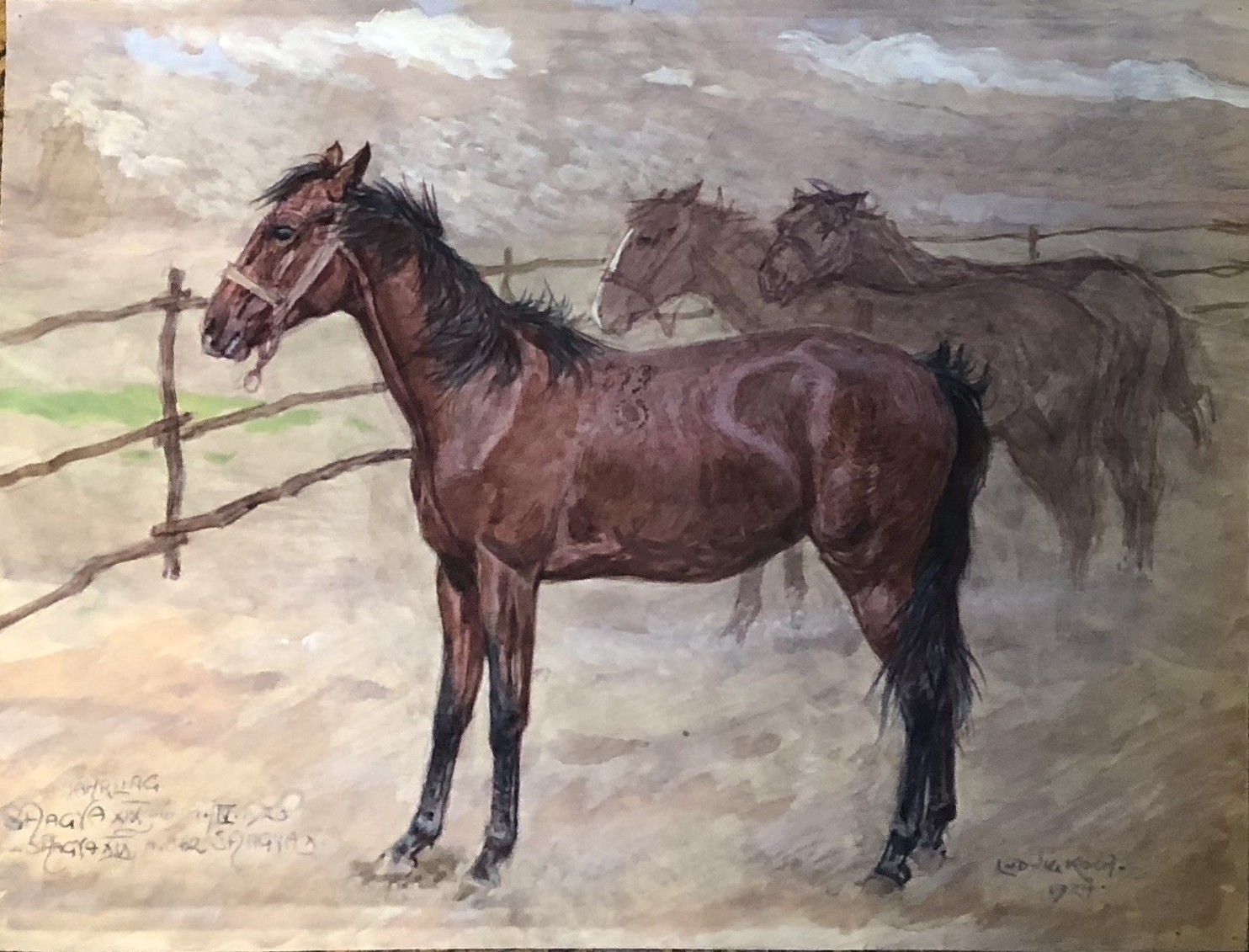 Suggestivo acquerello di Ludwig Koch, maestro della pittura equestre dell’area austro‑ungarica. L’opera presenta un cavallo sauro in primo piano, ritratto con la consueta precisione anatomica e un’attenzione quasi documentaria alla postura e alla muscolatura. Sullo sfondo, due cavalli emergono dalla polvere del recinto in comportamento affiliativo, creando profondità e atmosfera.
