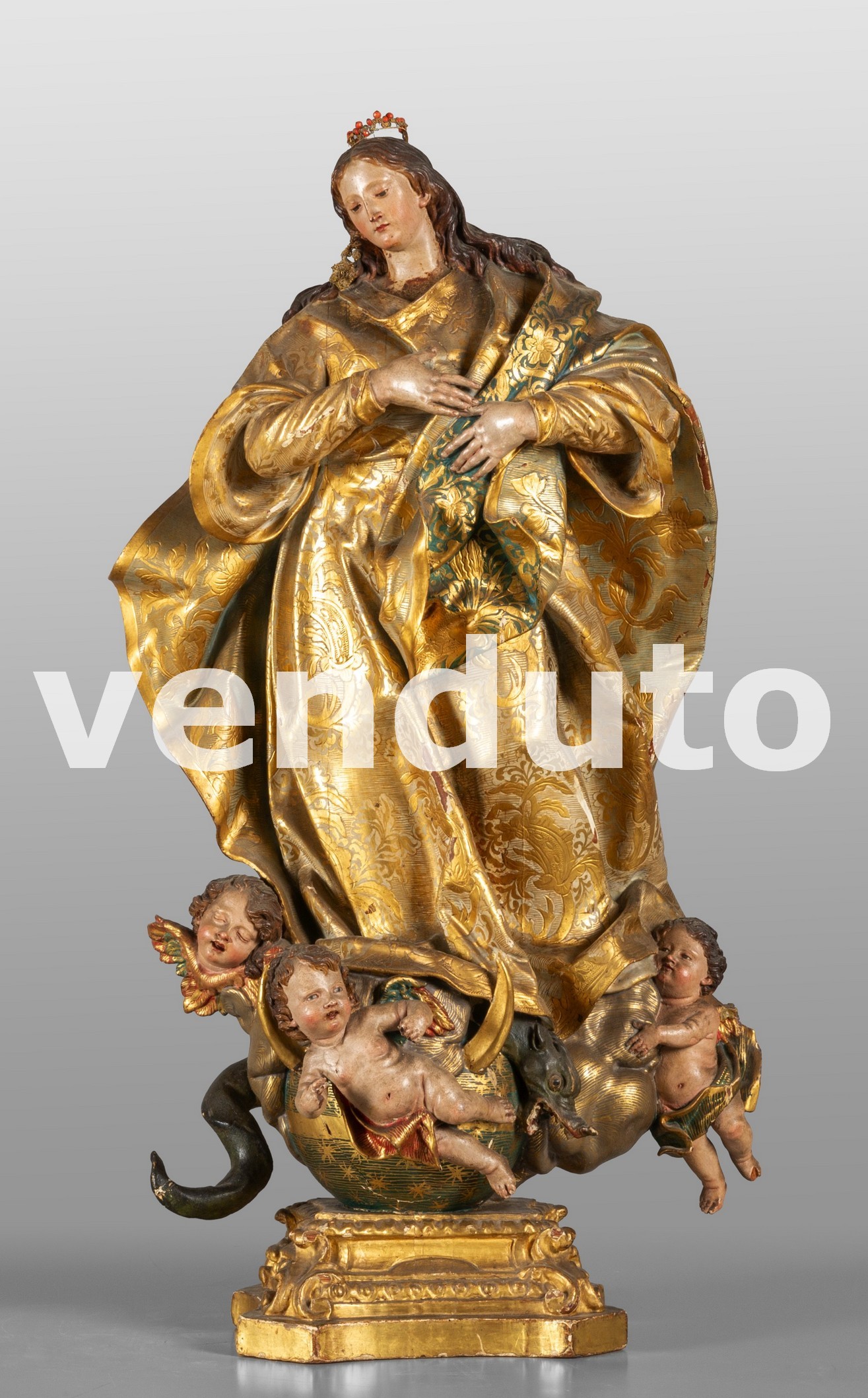 Madonna Immacolata, scultura in legno intagliato, dorato e laccato, I meta secolo XVIII (h.cm.95)