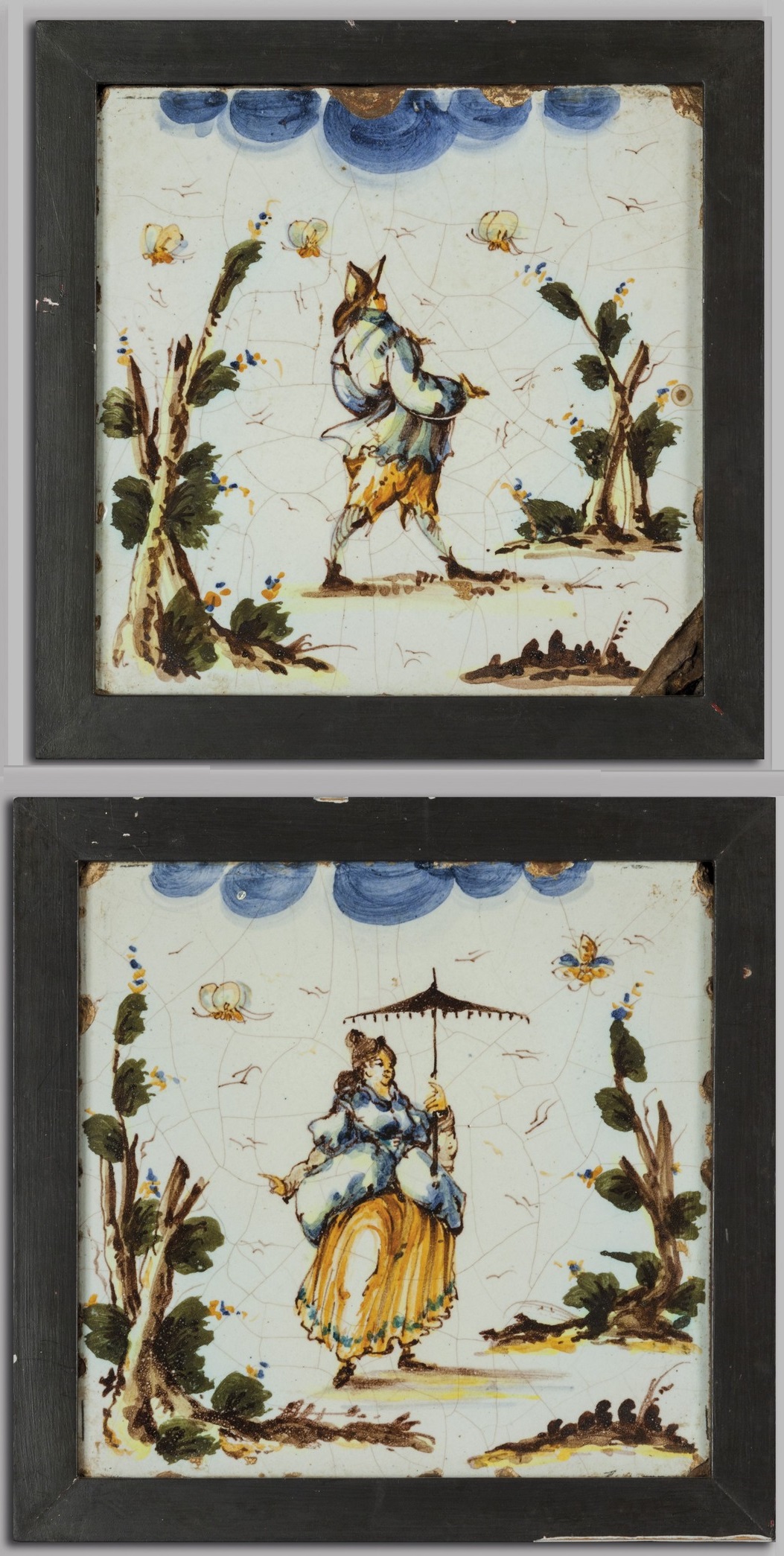 Coppia di mattonelle in ceramica policroma a fondo bianco con personaggi, Savona secolo XVIII