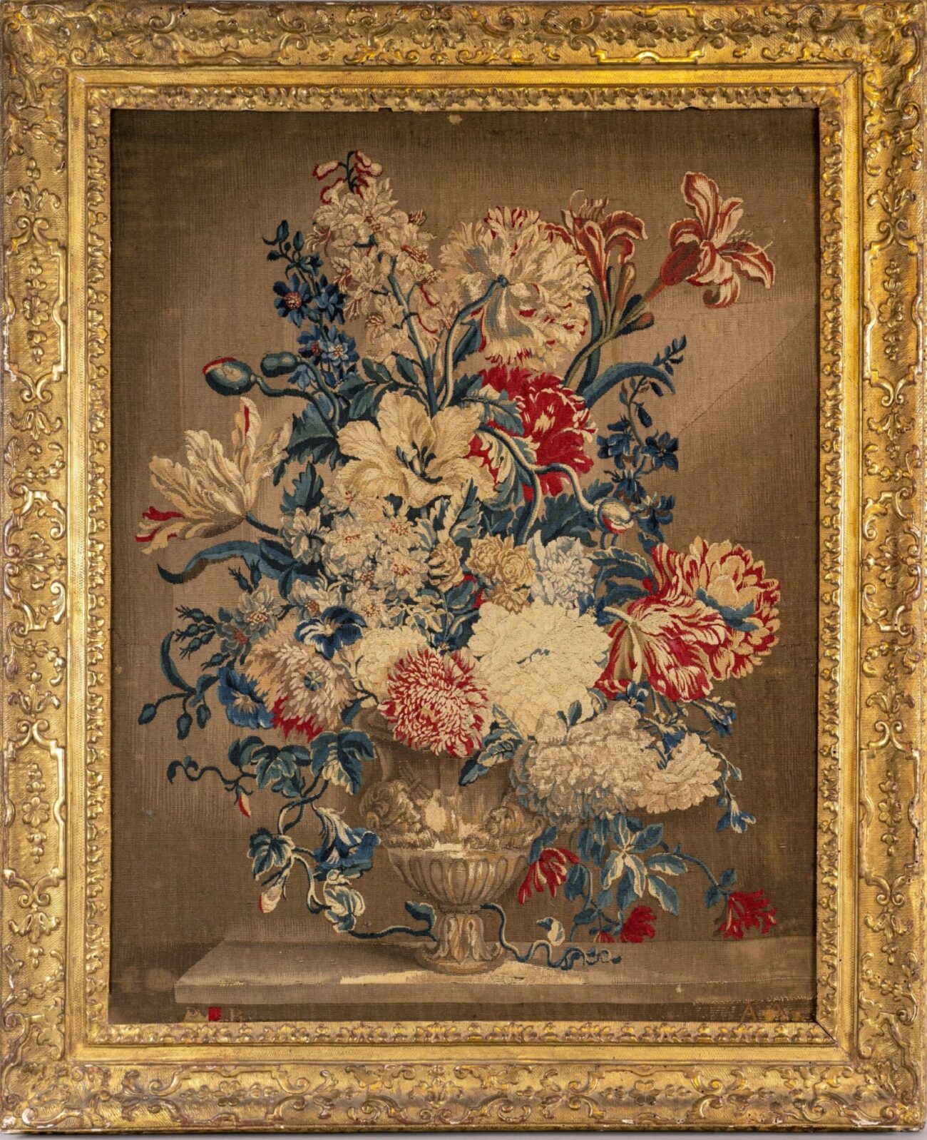 Natura morta di fiori, arazzo di Bruxelles in cornice in legno intagliato e dorato coeva, secolo XVII