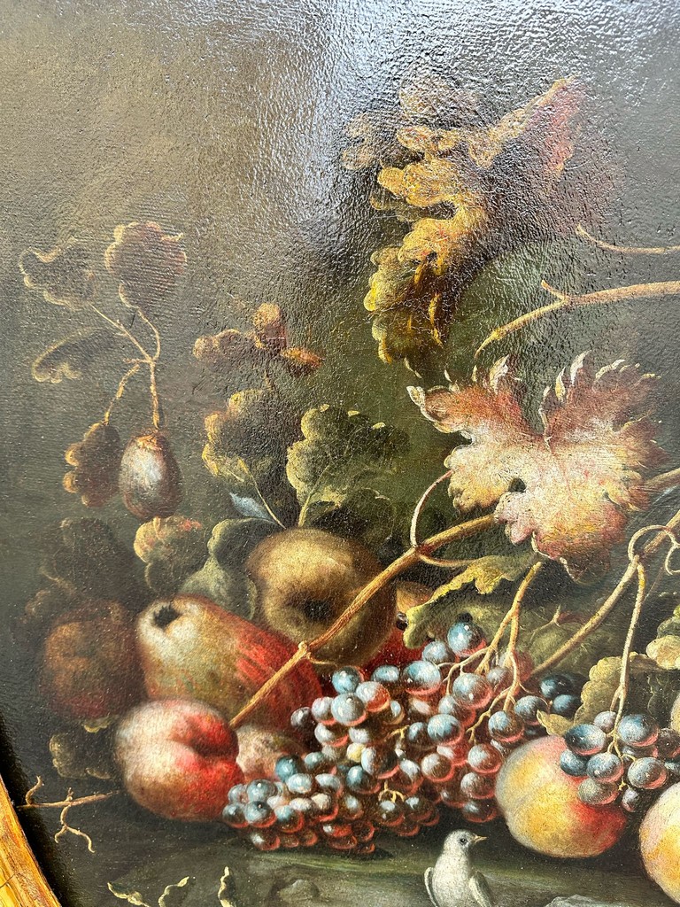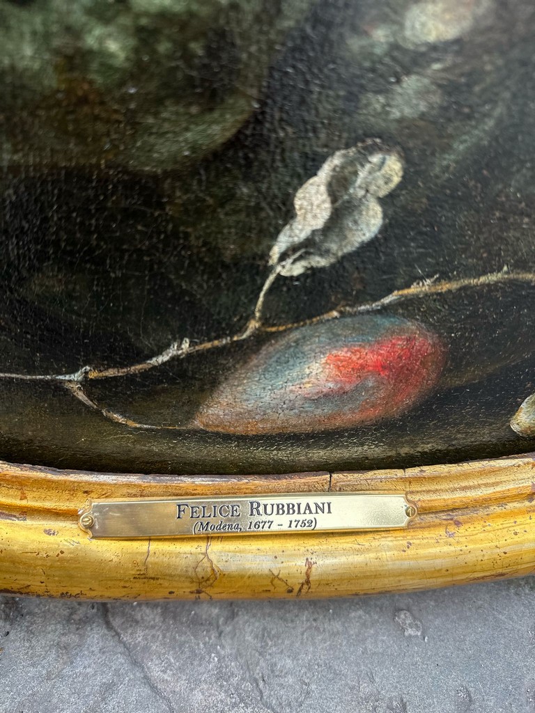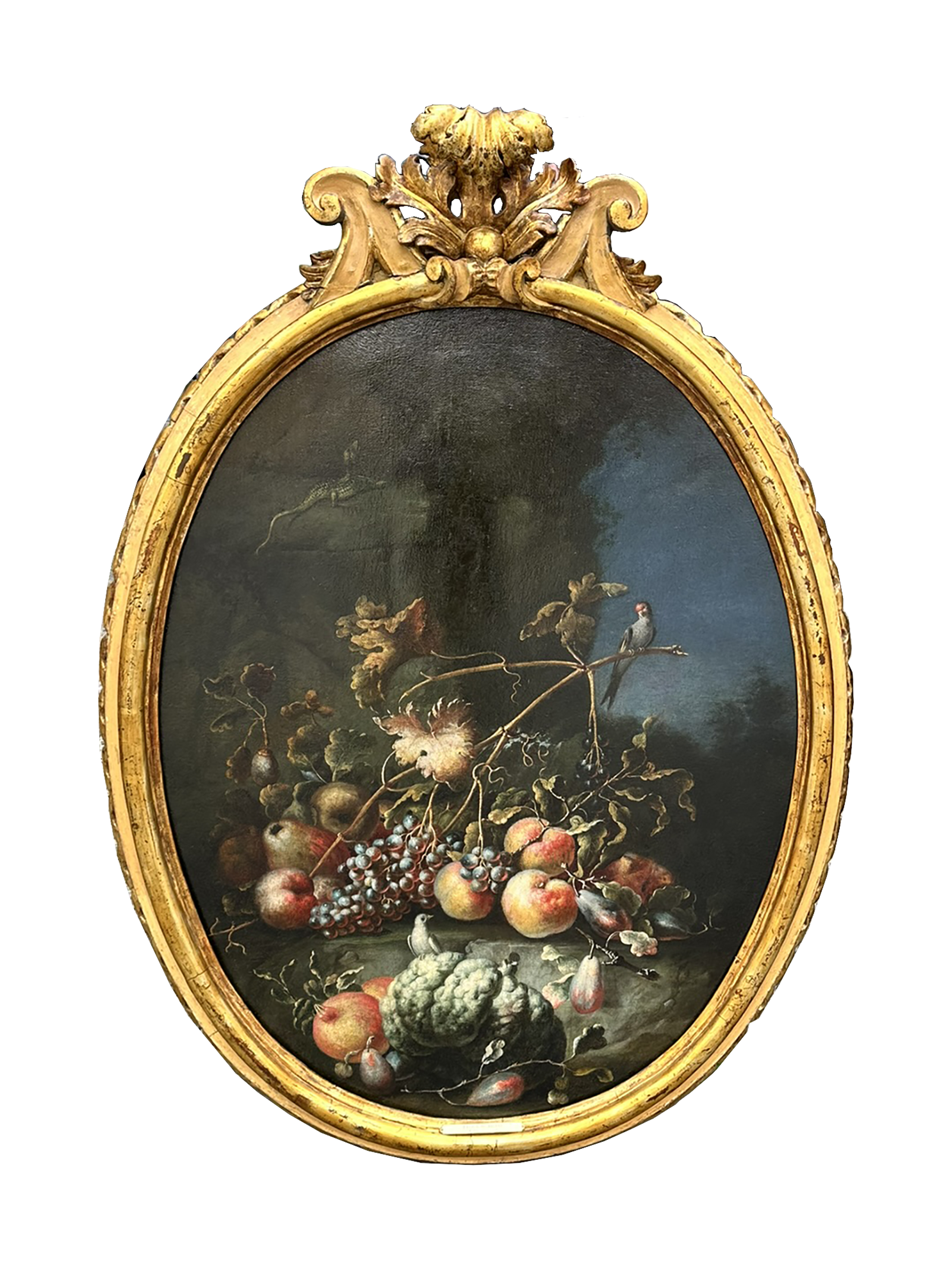 Felice Rubbiani (1677 1752), Natura morta all’aperto con frutti, un ramarro, un pappagallo e un colombo, olio su tela
