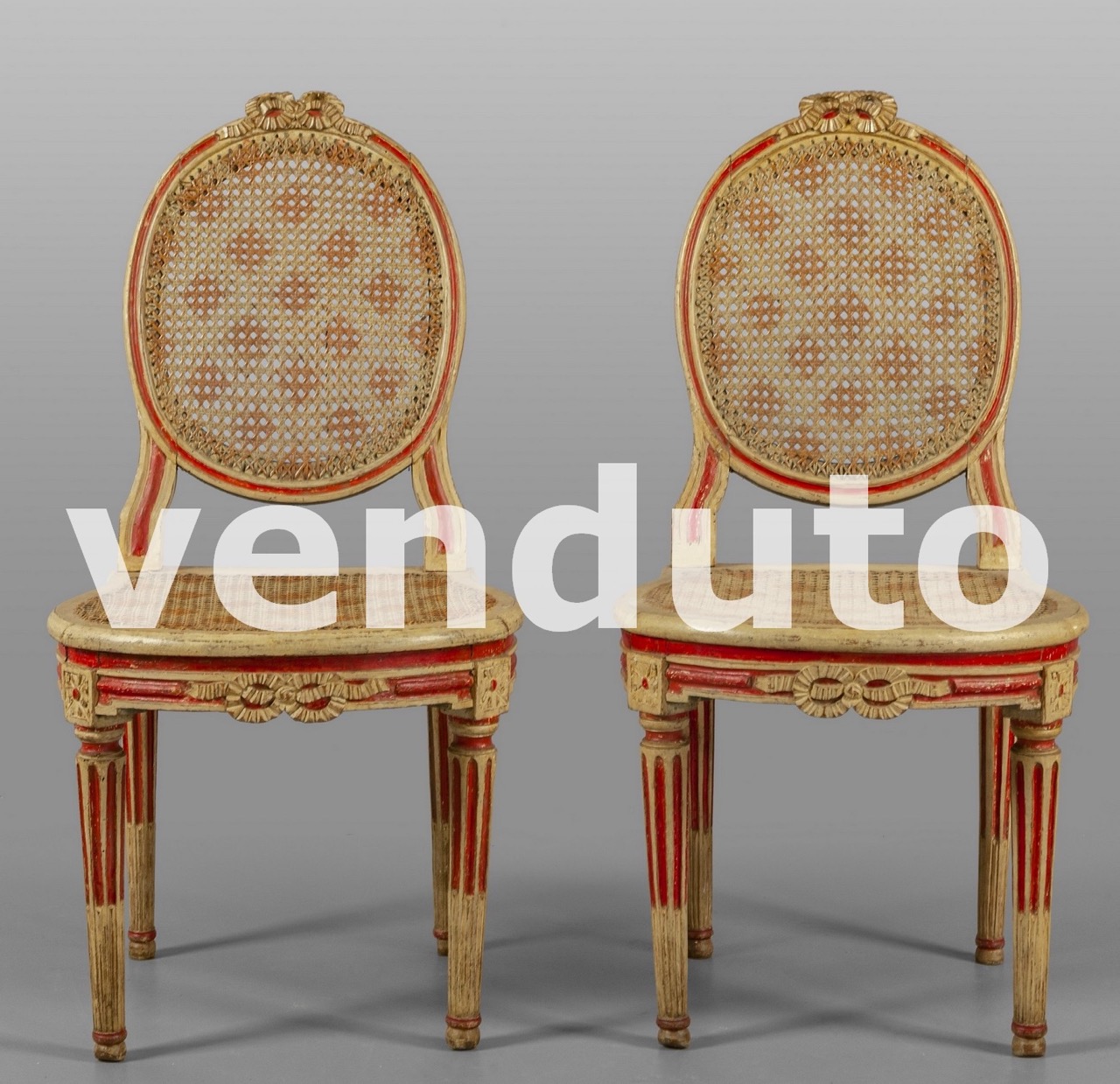 Coppia di sedie Luigi XVI in legno laccato e dorato con sedili e schienali a cannè, Piemonte II metà secolo XVIII