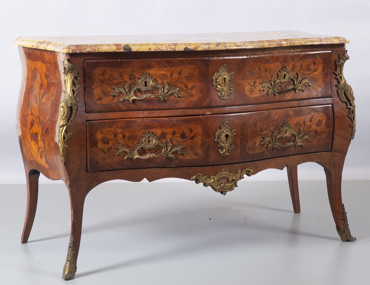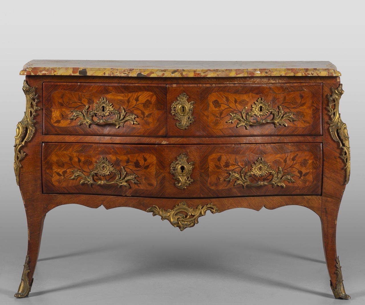 Movimentato sul fronte e sui fianchi, tre cassetti, piano in breccia, stampigliato nelle due fasce laterali del piano Pierre Migeon M.E. (Parigi 1740)
