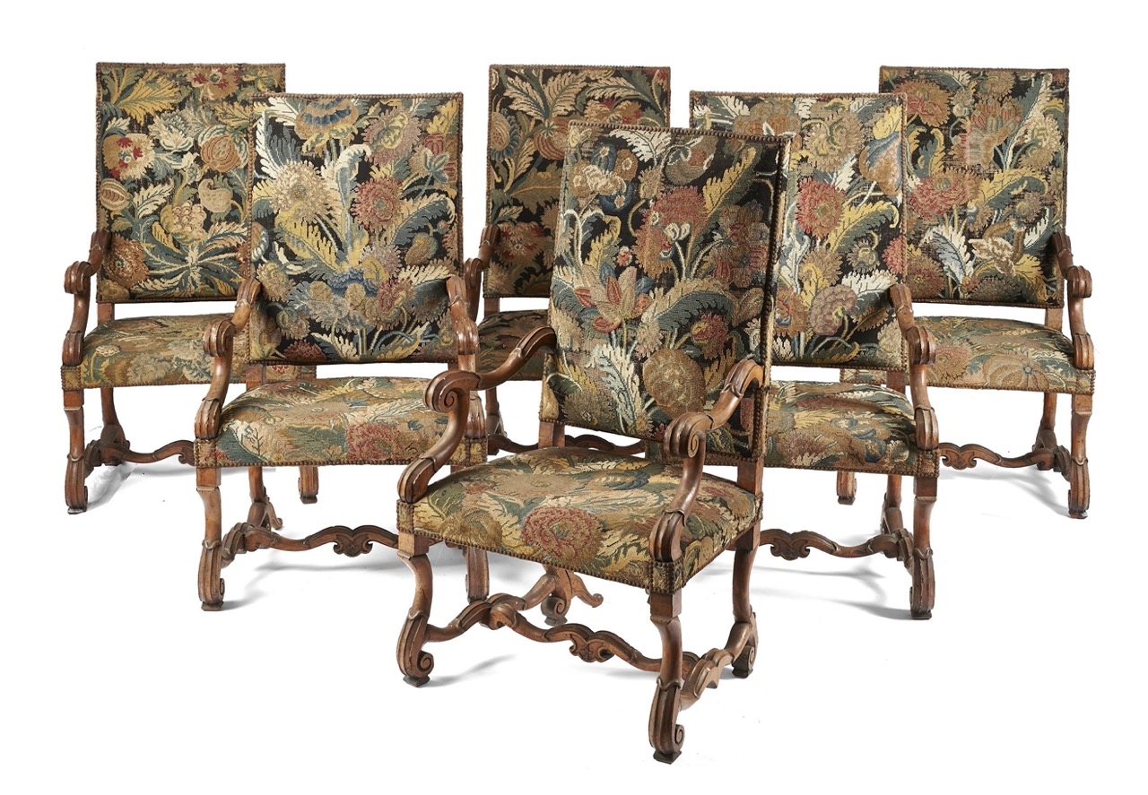 Gambe, montanti e braccioli terminanti a ricciolo, traverse sagomate decorate da motivo vegetale. Seduta e schienale rivestiti in tessuto Aubusson