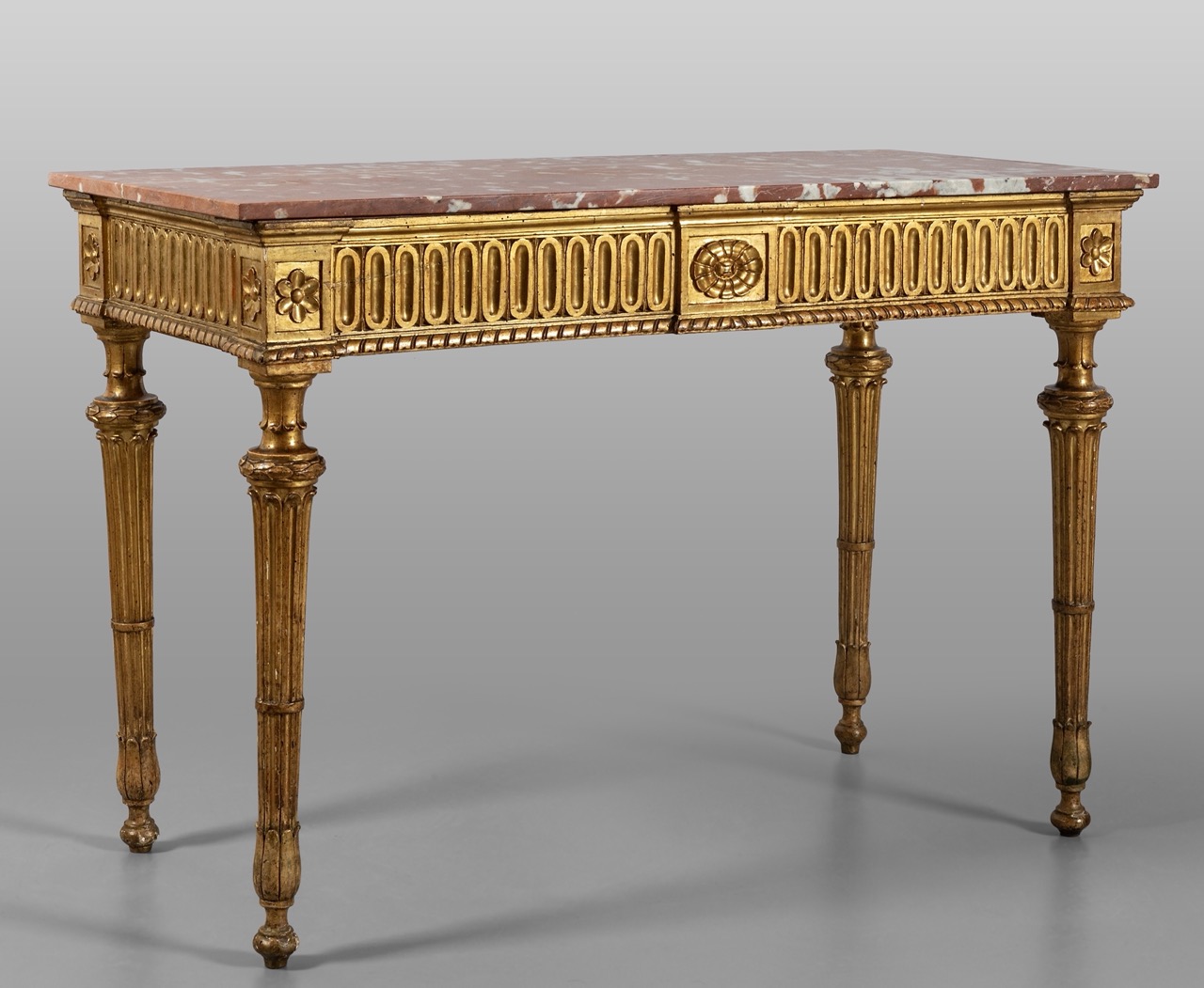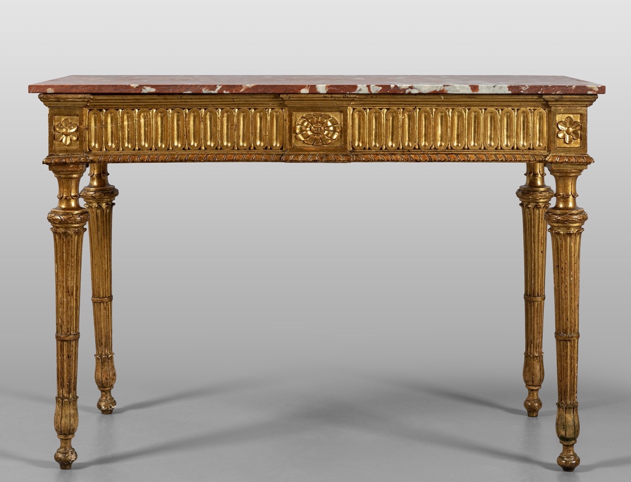Consolle Luigi XVI in legno intagliato e dorato, piano in marmo, Genova fine secolo XVIII