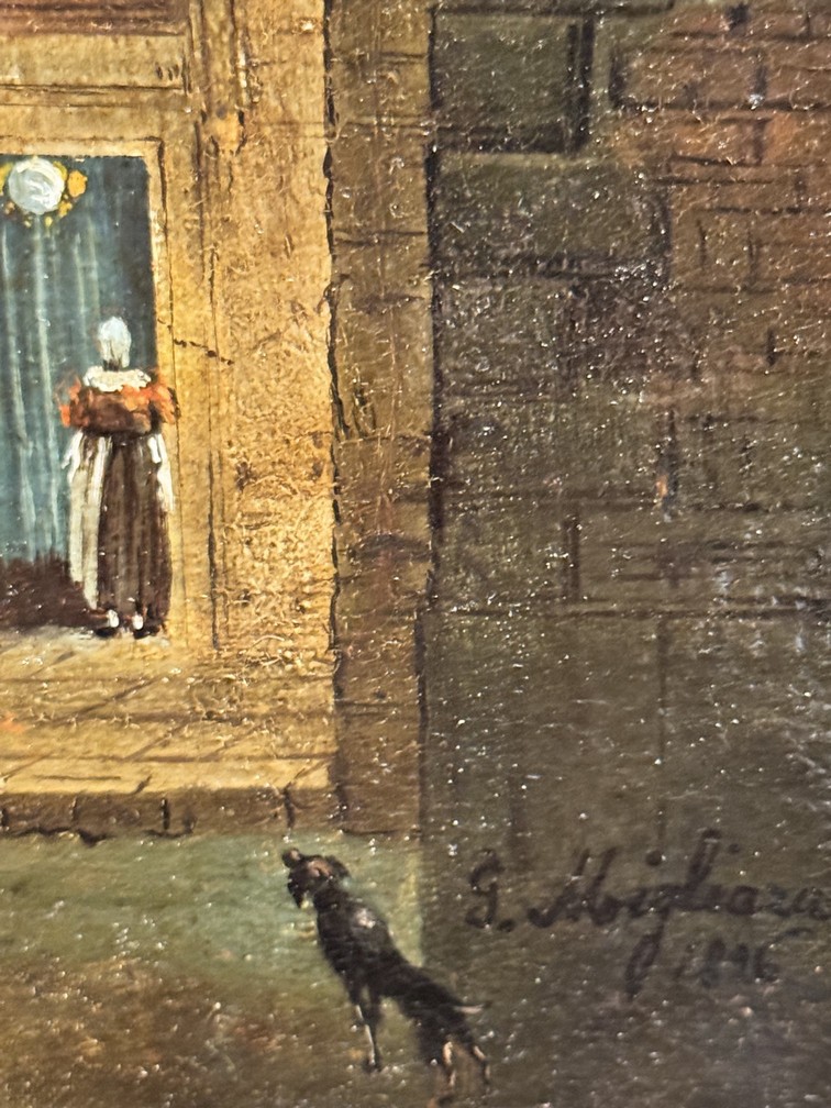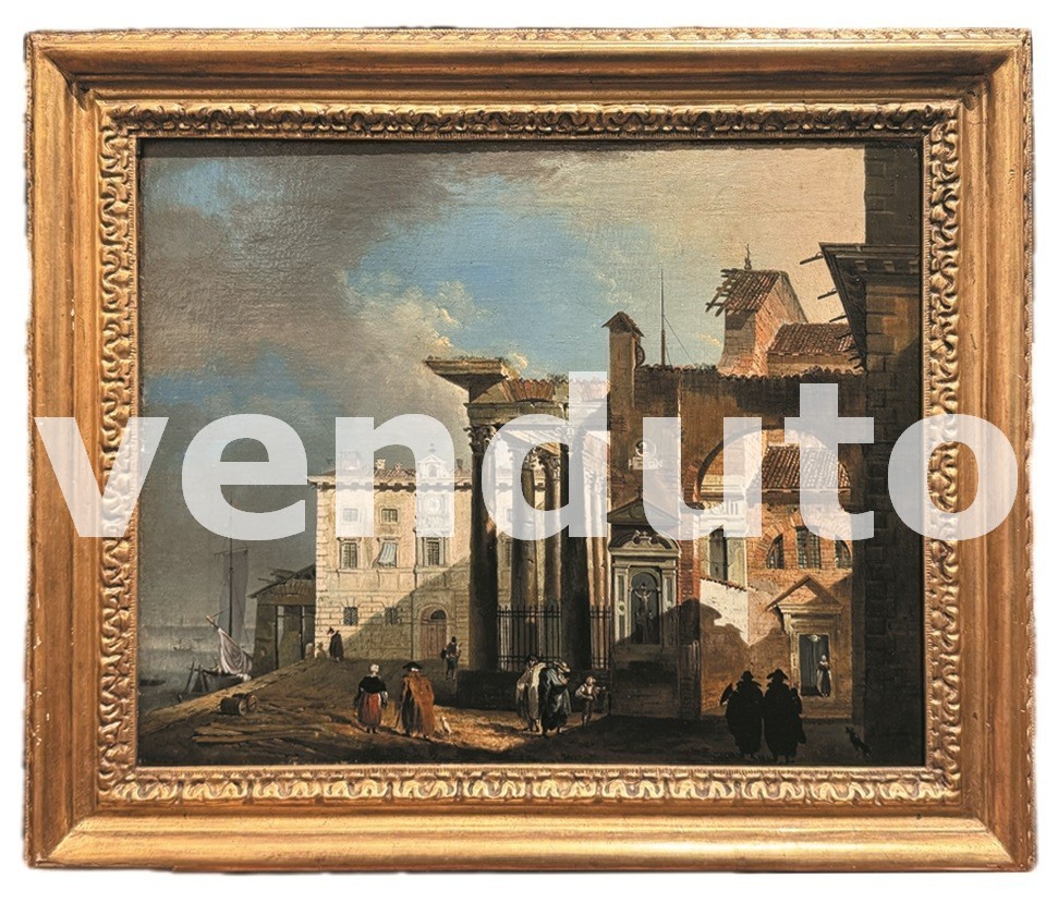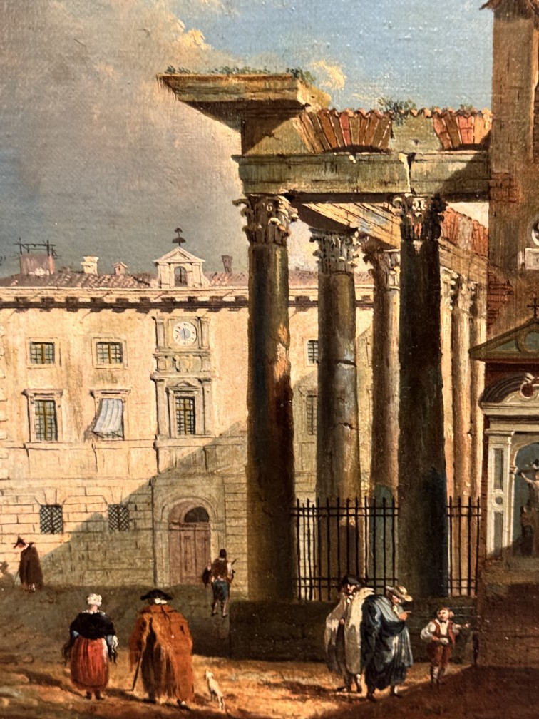 Curiosa intuizione del pittore collocare le colonne di San Lorenzo ai bordi di una calle veneziana: trae ispirazione dai grandi vedutisti veneziani del Settecento.