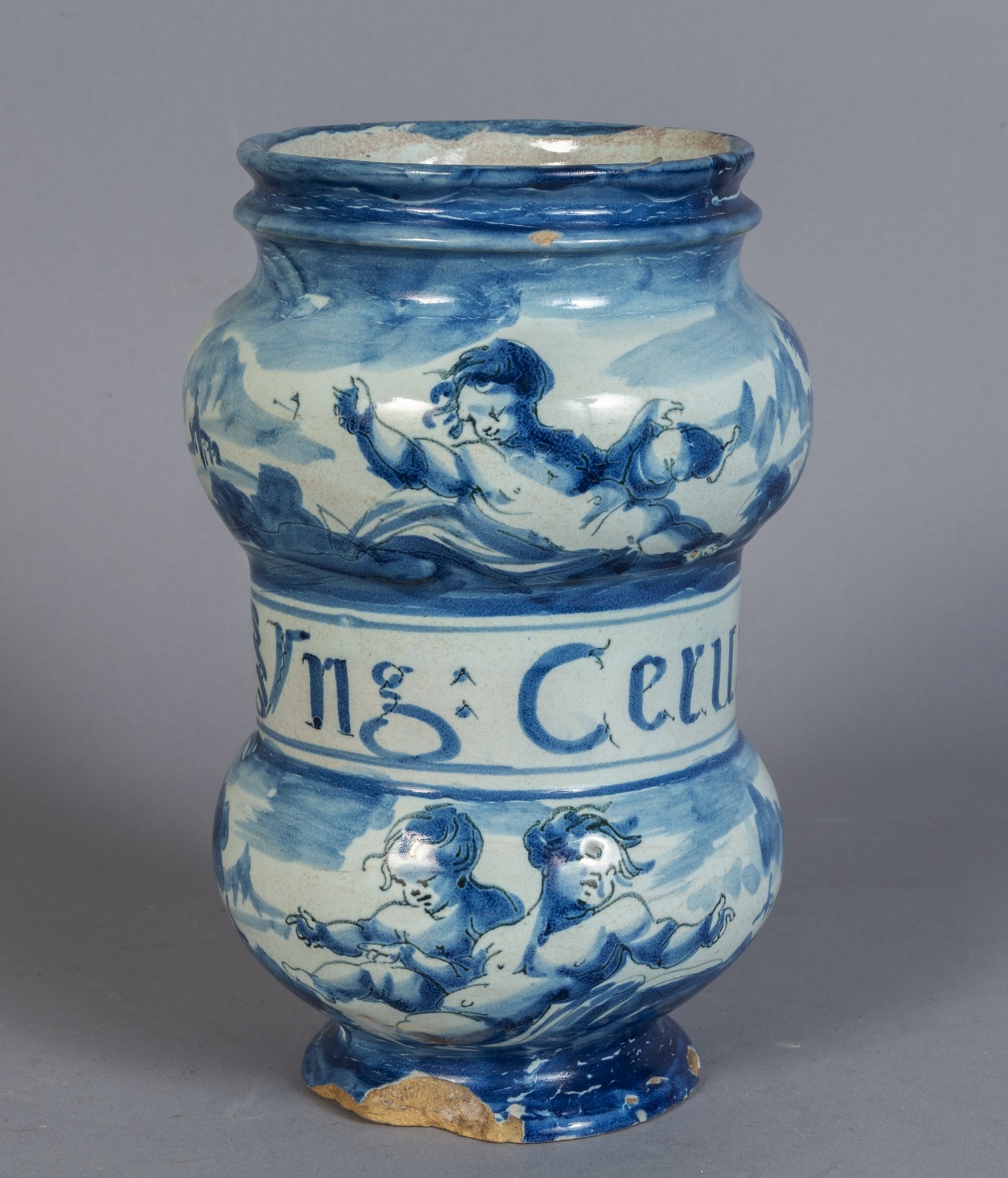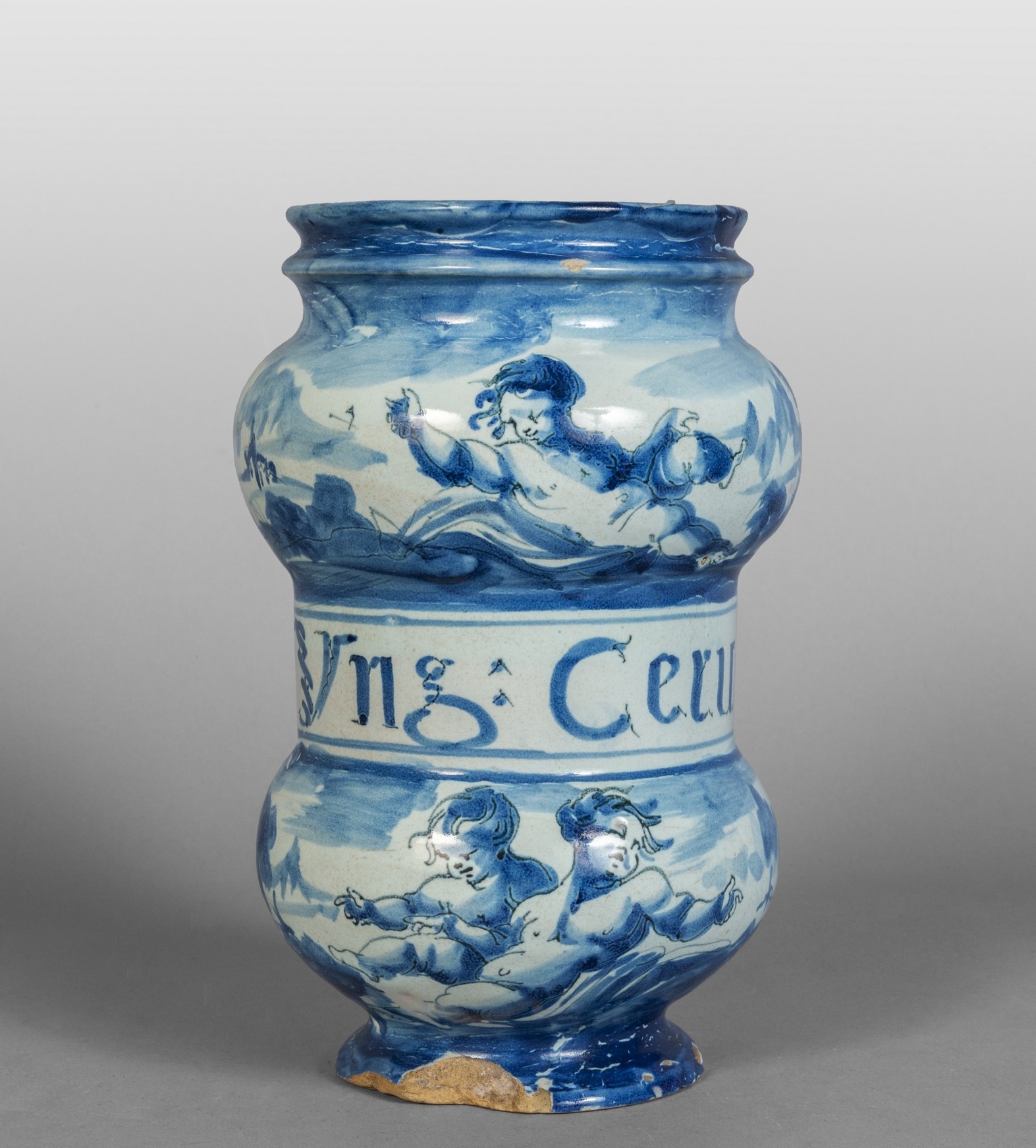 Albarello in ceramica a decorazione bianca e blu, scritta medicinale “Unguento Cerus”, marca Lanterna, Savona secolo XVIII