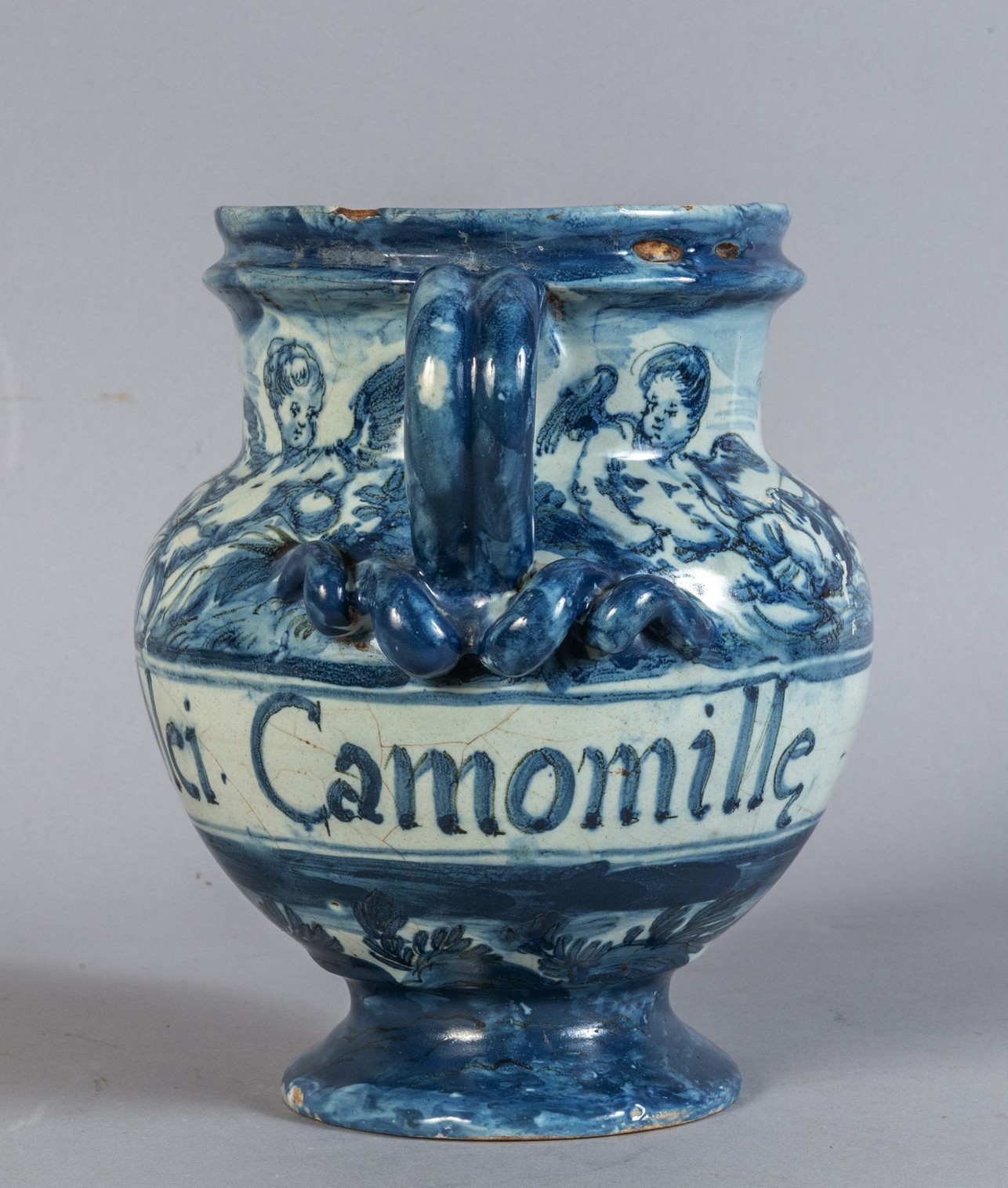Vaso da farmacia o chervette in ceramica a decorazione bianca e blu, Savona secolo XVIII