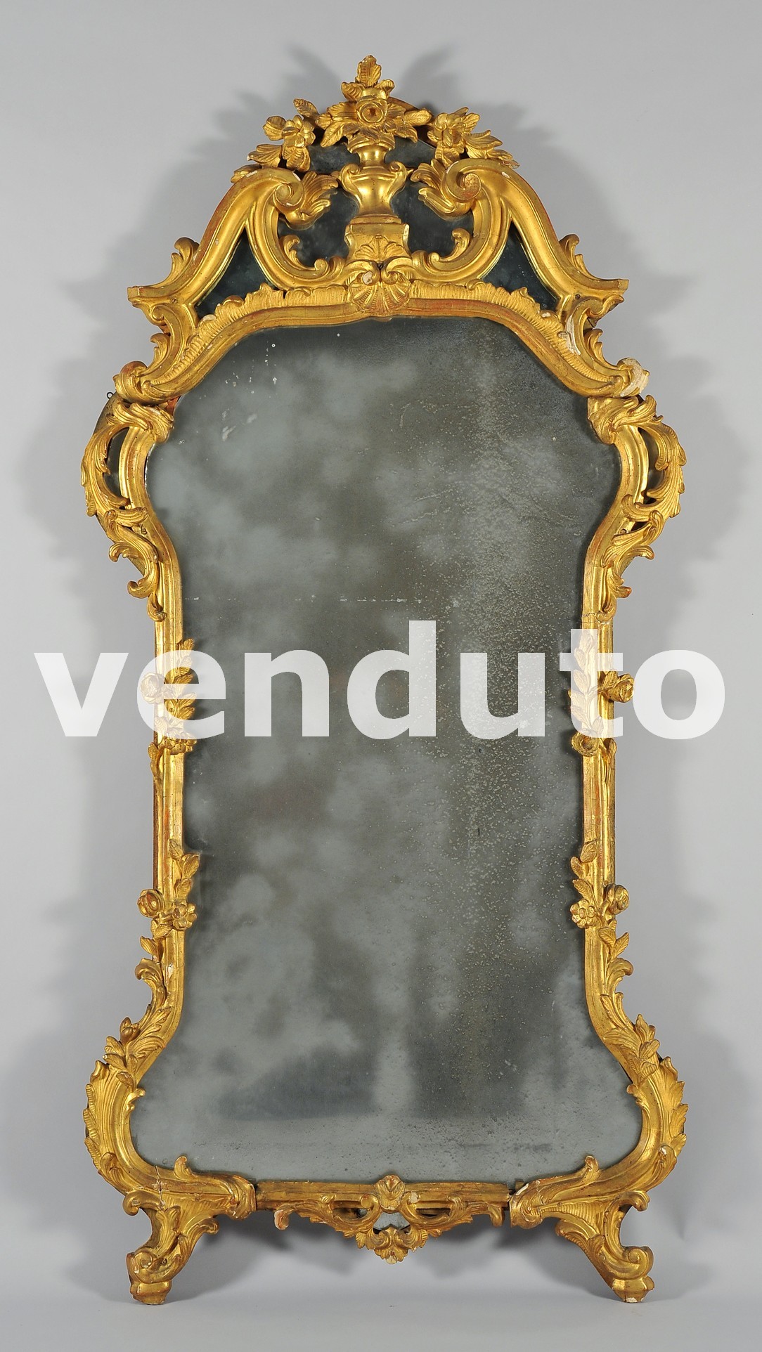 Specchiera barocchetto genovese in legno finemente intagliato e dorato con i motivi della pellaccia; Genova I metà del secolo XVIII