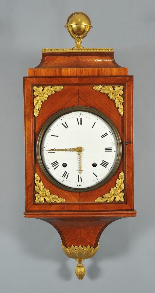 Orologio a Cartel Luigi XV lastronato in legno di rosa con ricca applicazione di bronzi dorati, Francia secolo XVIII