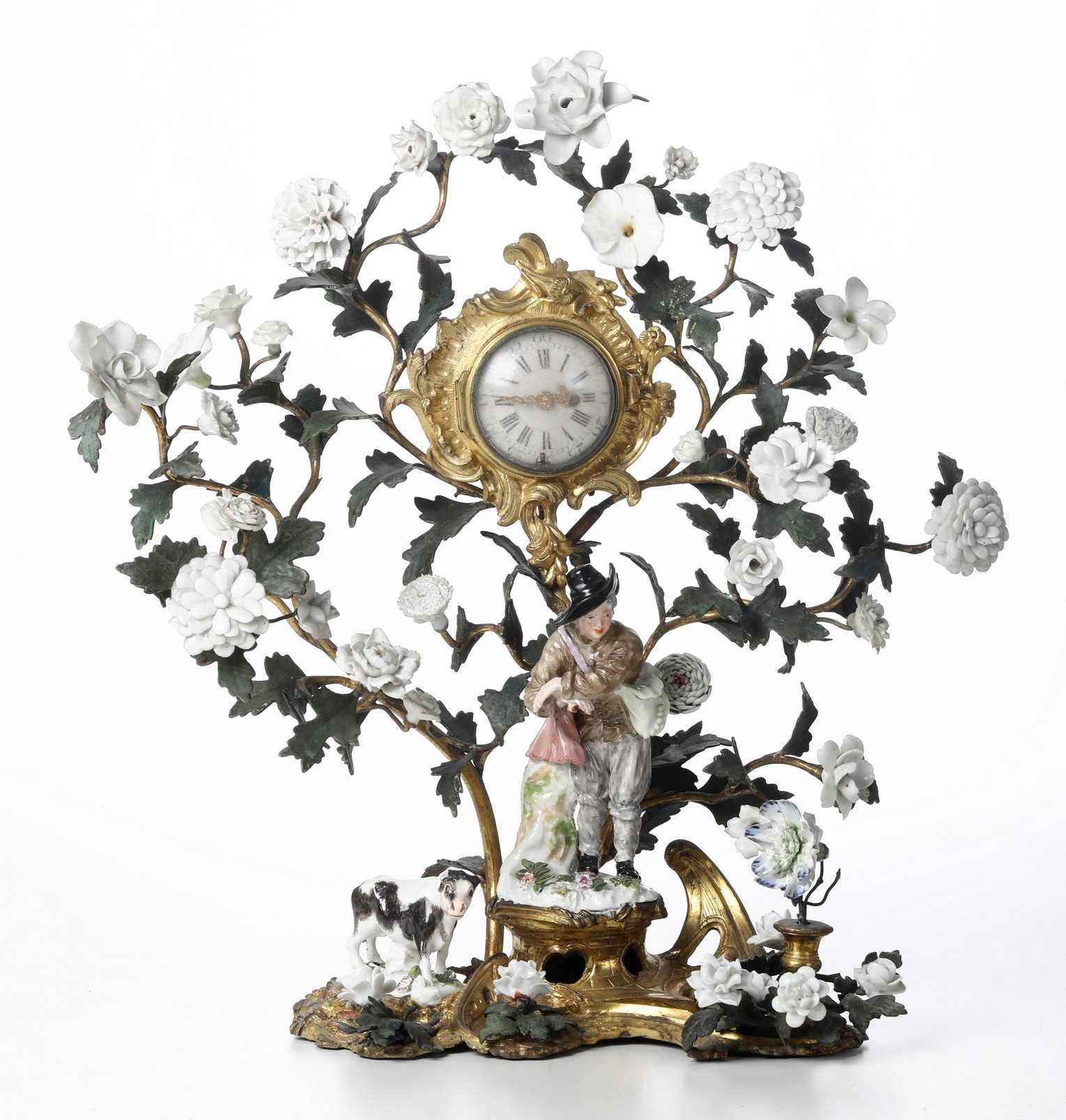 Orologio con cassa cesellata a rocailles, con applicazioni di fiori in porcellana policroma, quadrante a numeri romani per le ore e arabi per i minuti, base arricchita da figura di pastore con cane in porcellana.