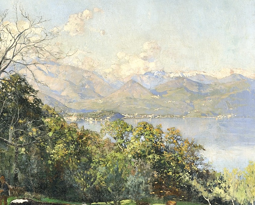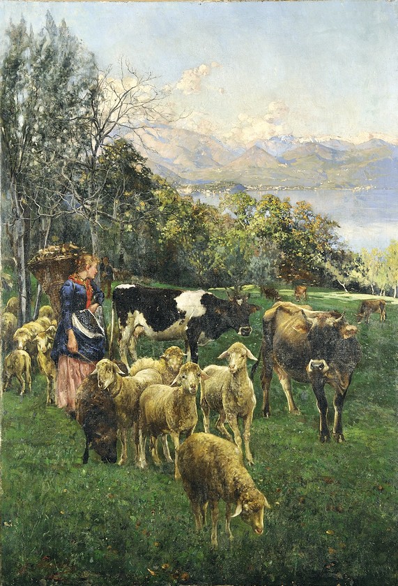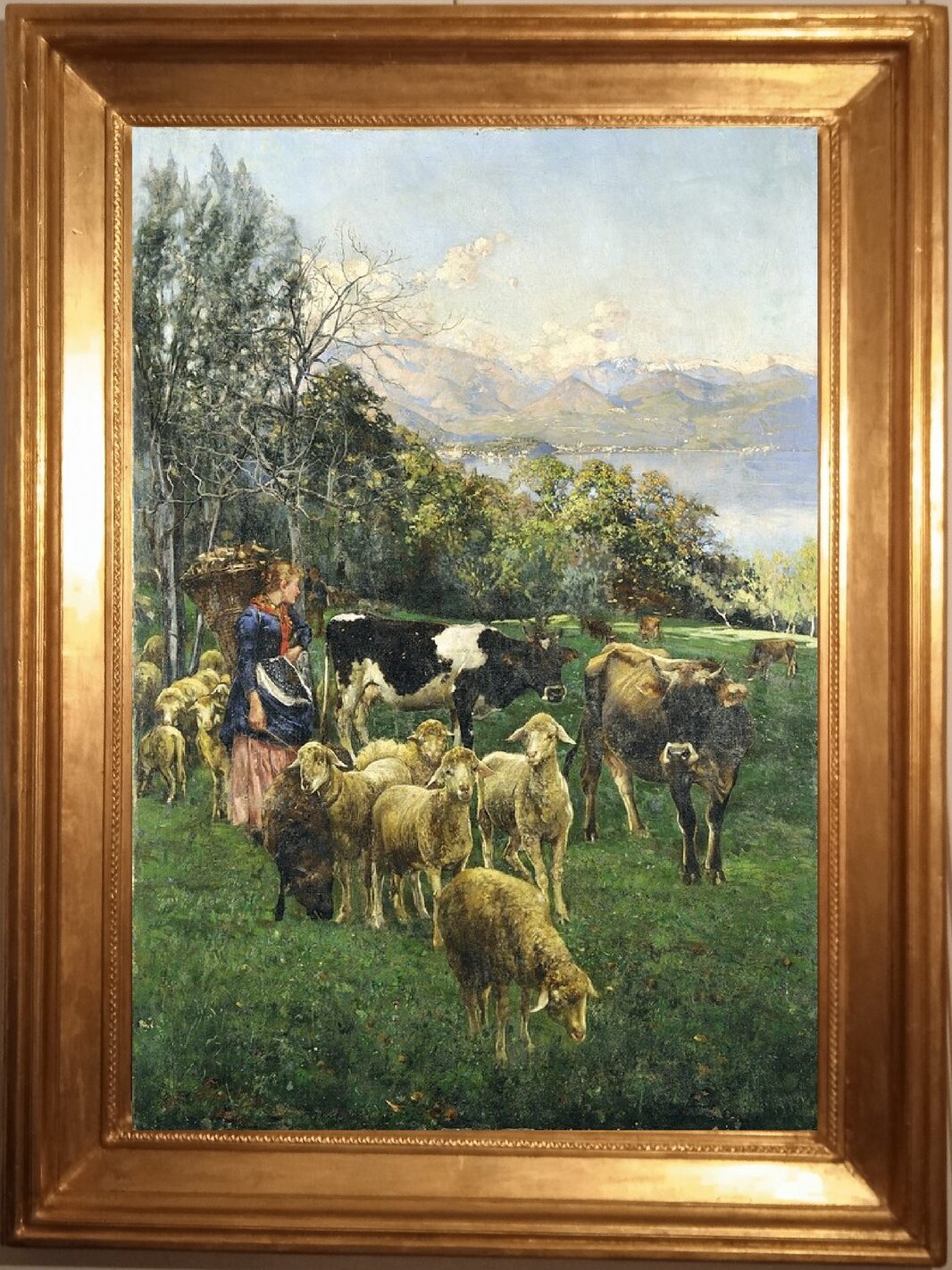 Questo incantevole olio su tela di Giuseppe Pennasilico è un perfetto esempio della sensibilità pittorica dell’artista per il paesaggio rurale e la vita agreste. La scena, immersa in una luce delicata e naturale, ritrae una giovane pastorella intenta a condurre il suo gregge e alcuni bovini su un prato verdeggiante, con lo sfondo delle maestose montagne e delle sponde del Lago Maggiore, nei pressi della celebre Villa Pallavicino.