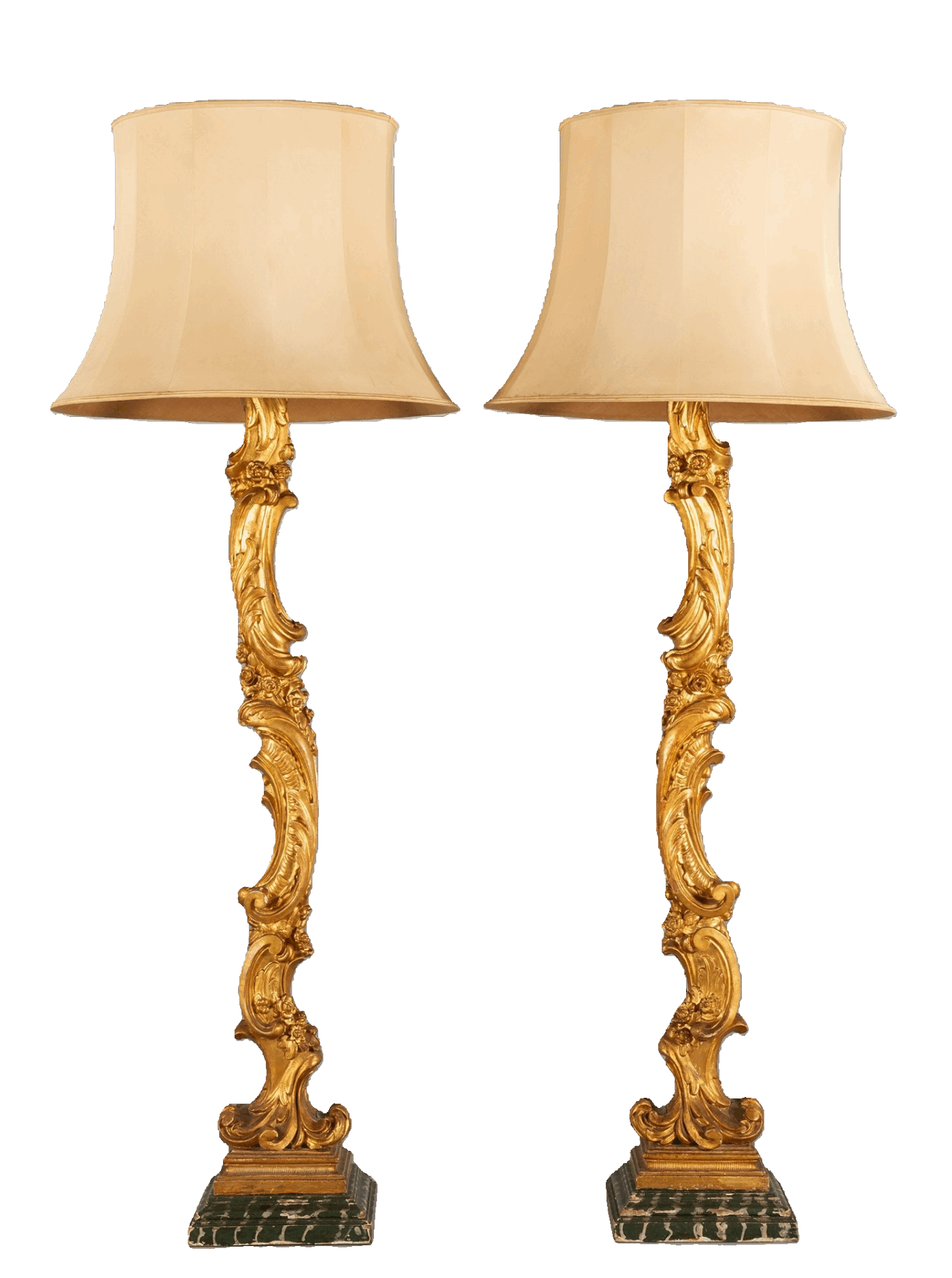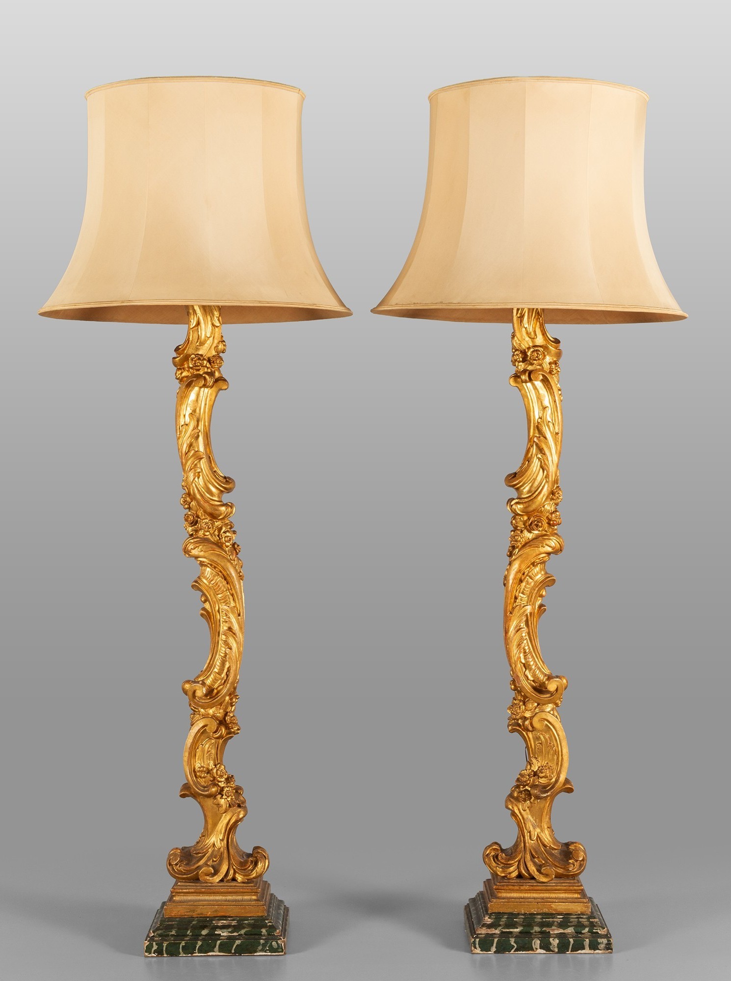 Coppia di piantane in legno finemente intagliato e dorato, basi laccate a finto marmo, Italia secolo XIX