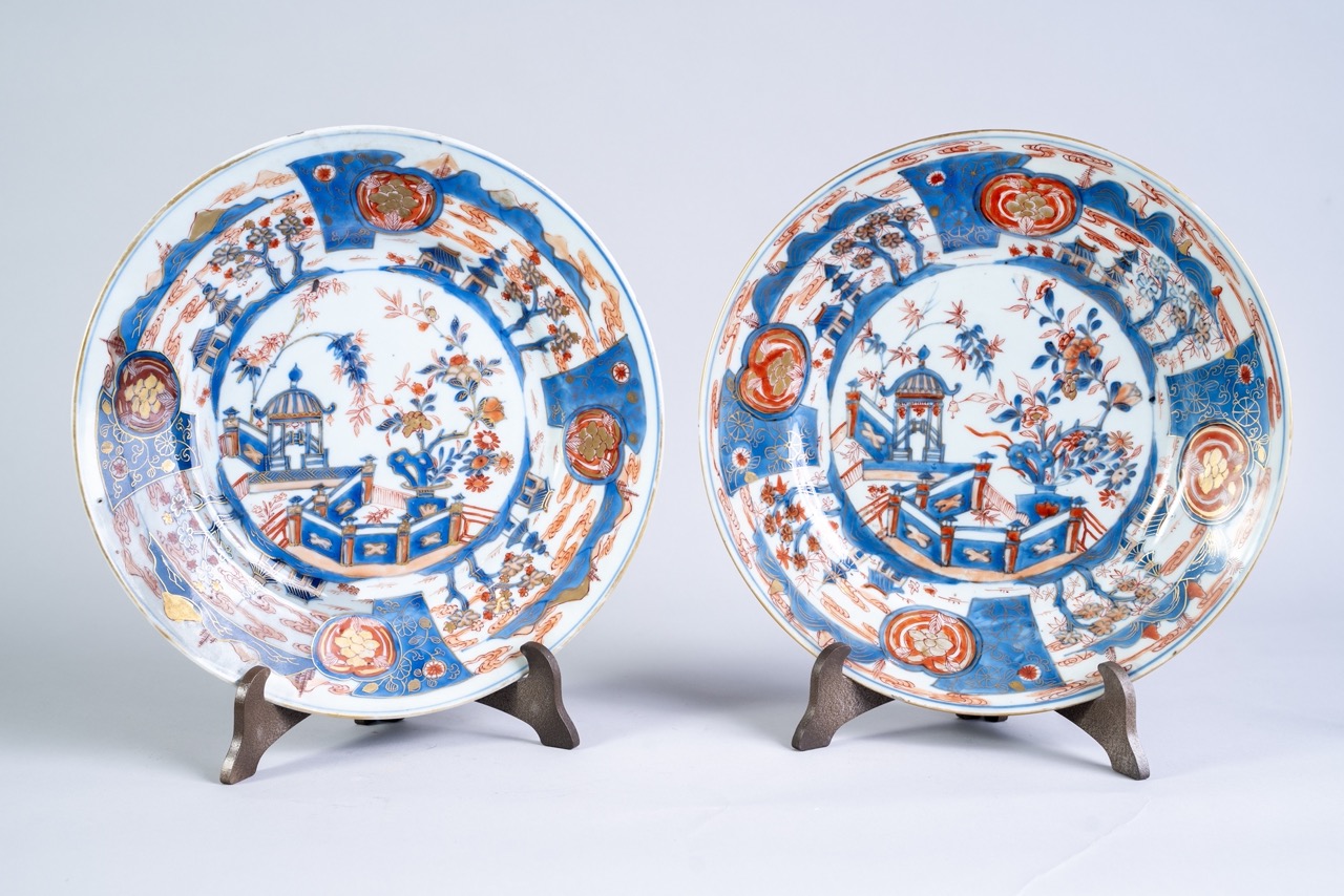 Coppia di piatti in porcellana Imari lumeggiati in oro a freddo, Giappone secolo XVIII