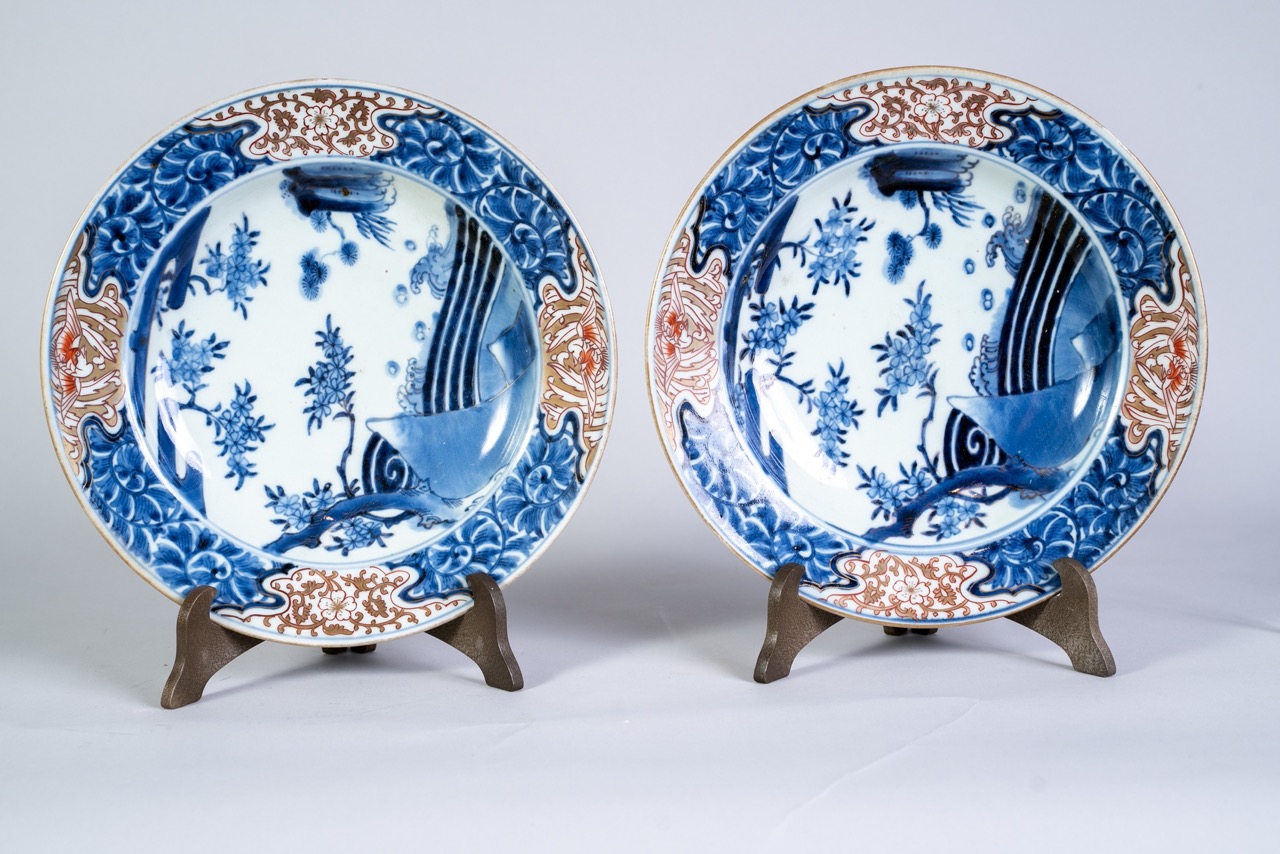 Sul bordo quattro riserve decorate a fiori e uccelli in rosso e oro.