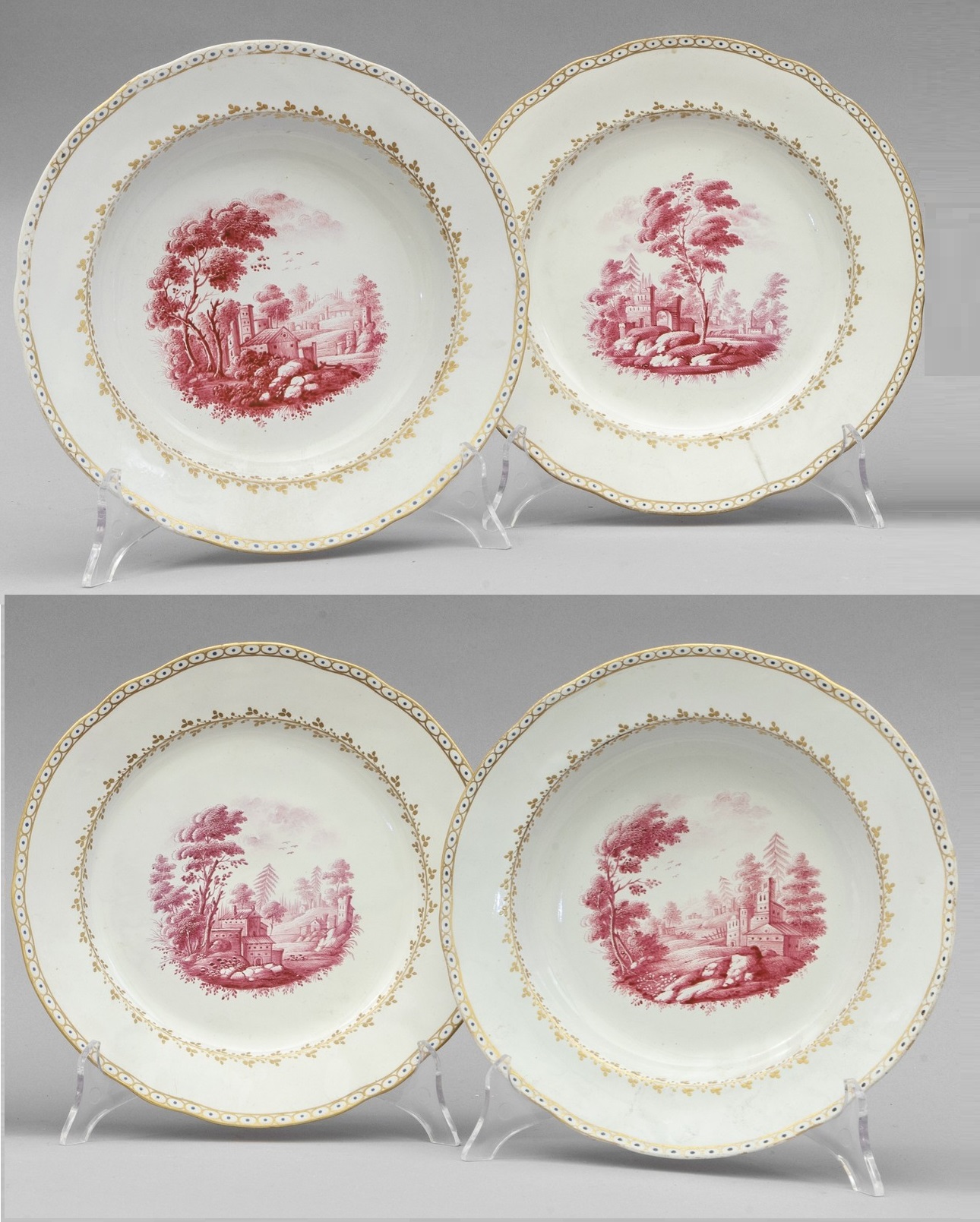 Due piatti piani e due fondi in porcellana Ginori, decorazione a sanguigna con paesaggi, secolo XVIII