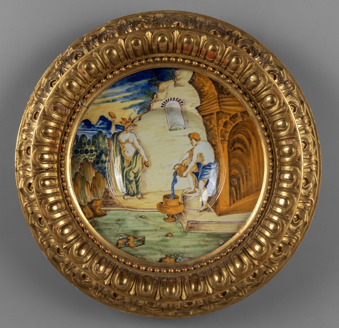 Piatto in ceramica policroma, cornice in legno intagliato e dorato, Venezia secolo XVI