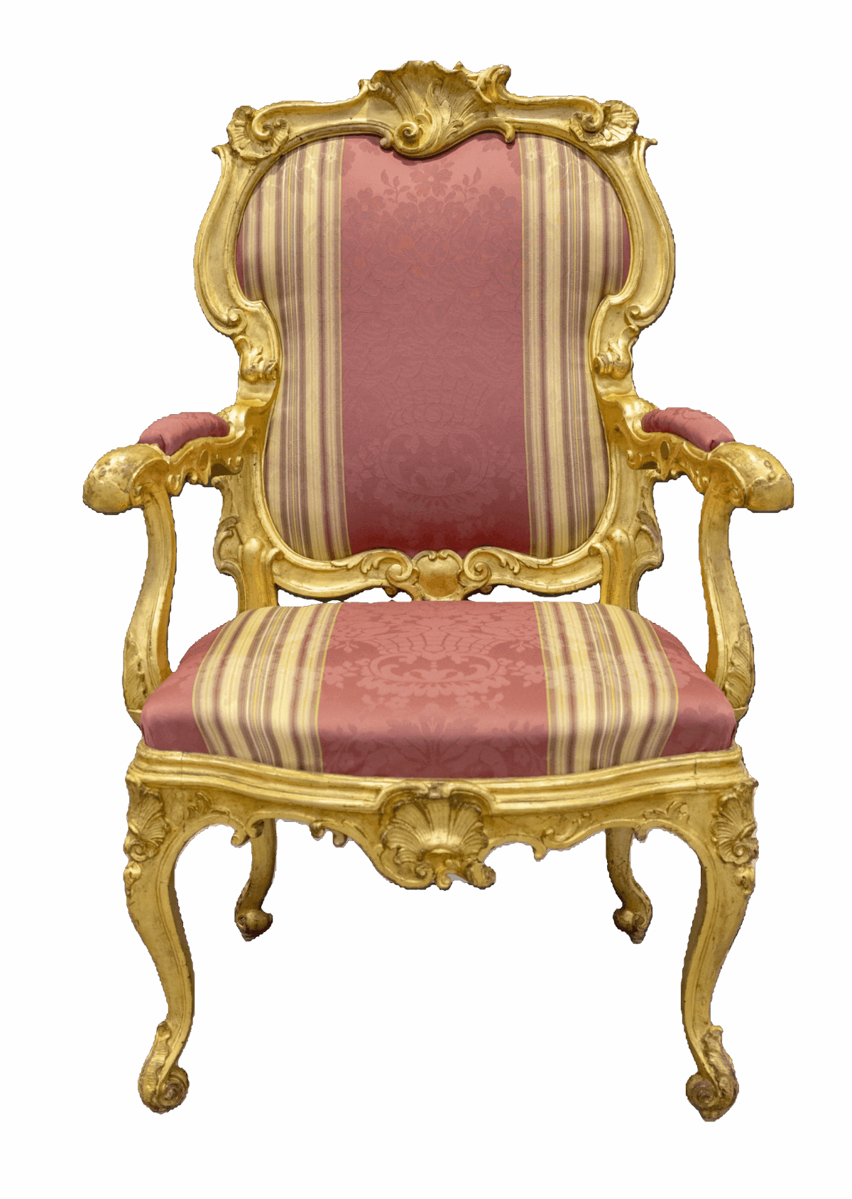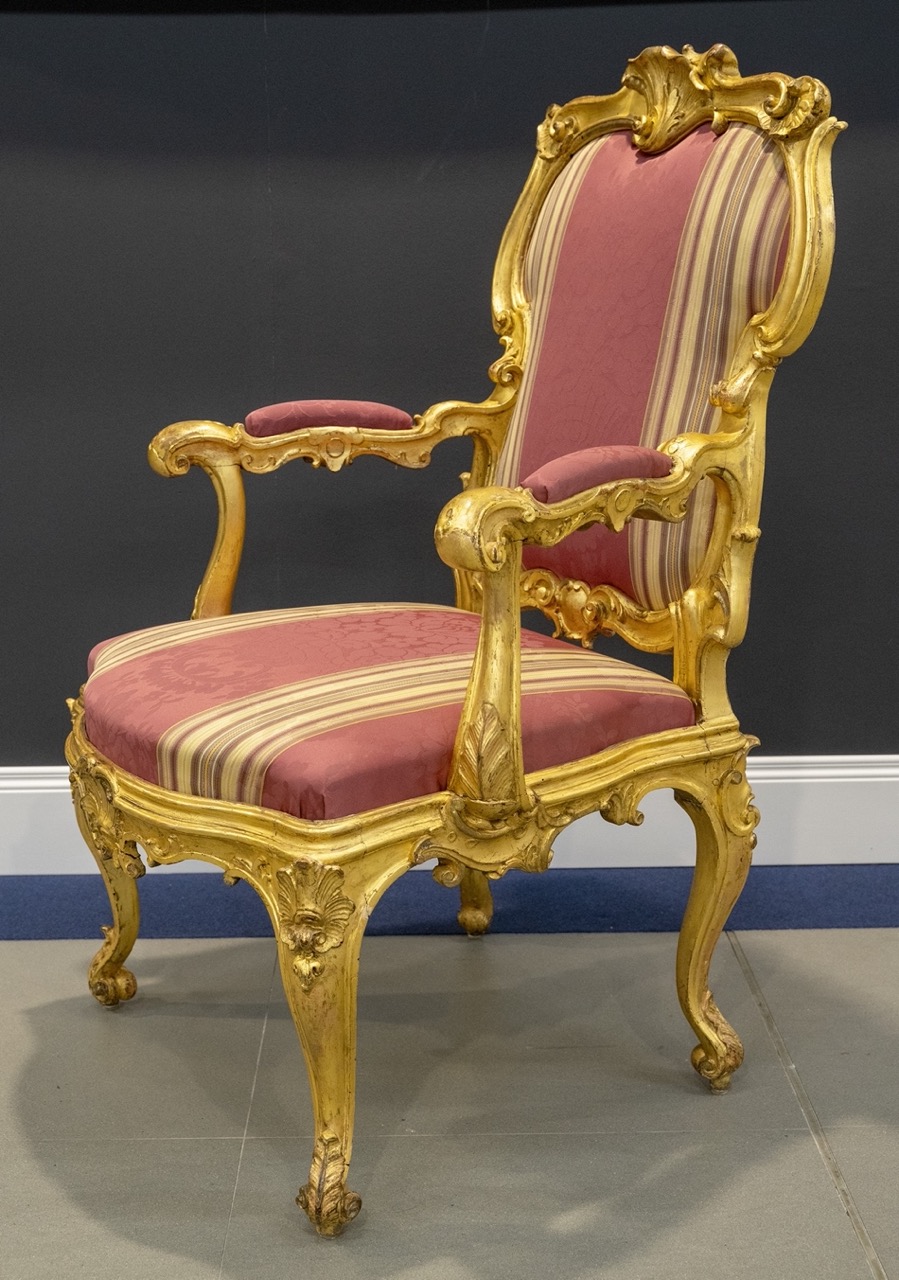 Poltrona Luigi XV in legno intagliato a volute barocche e dorato, Roma prima metà secolo XVIII