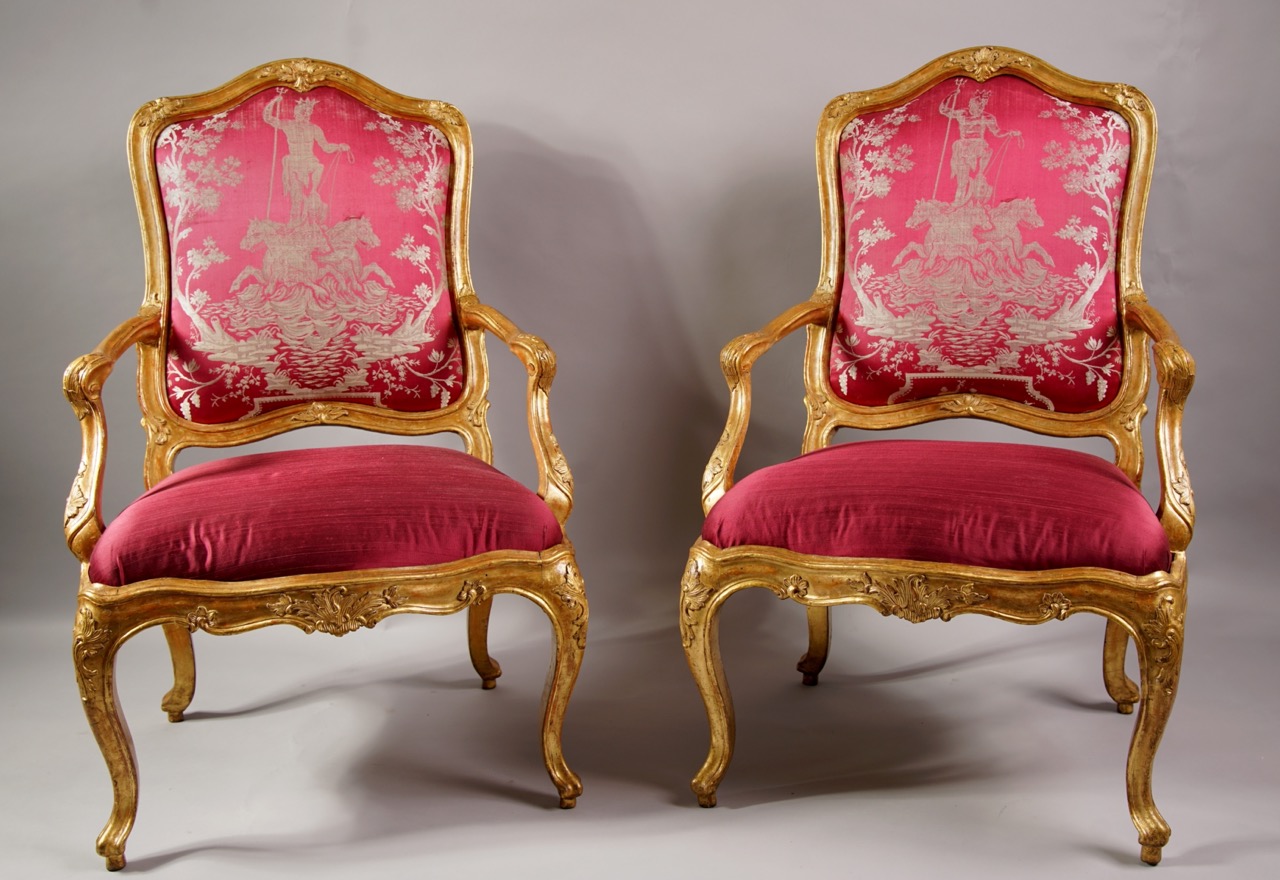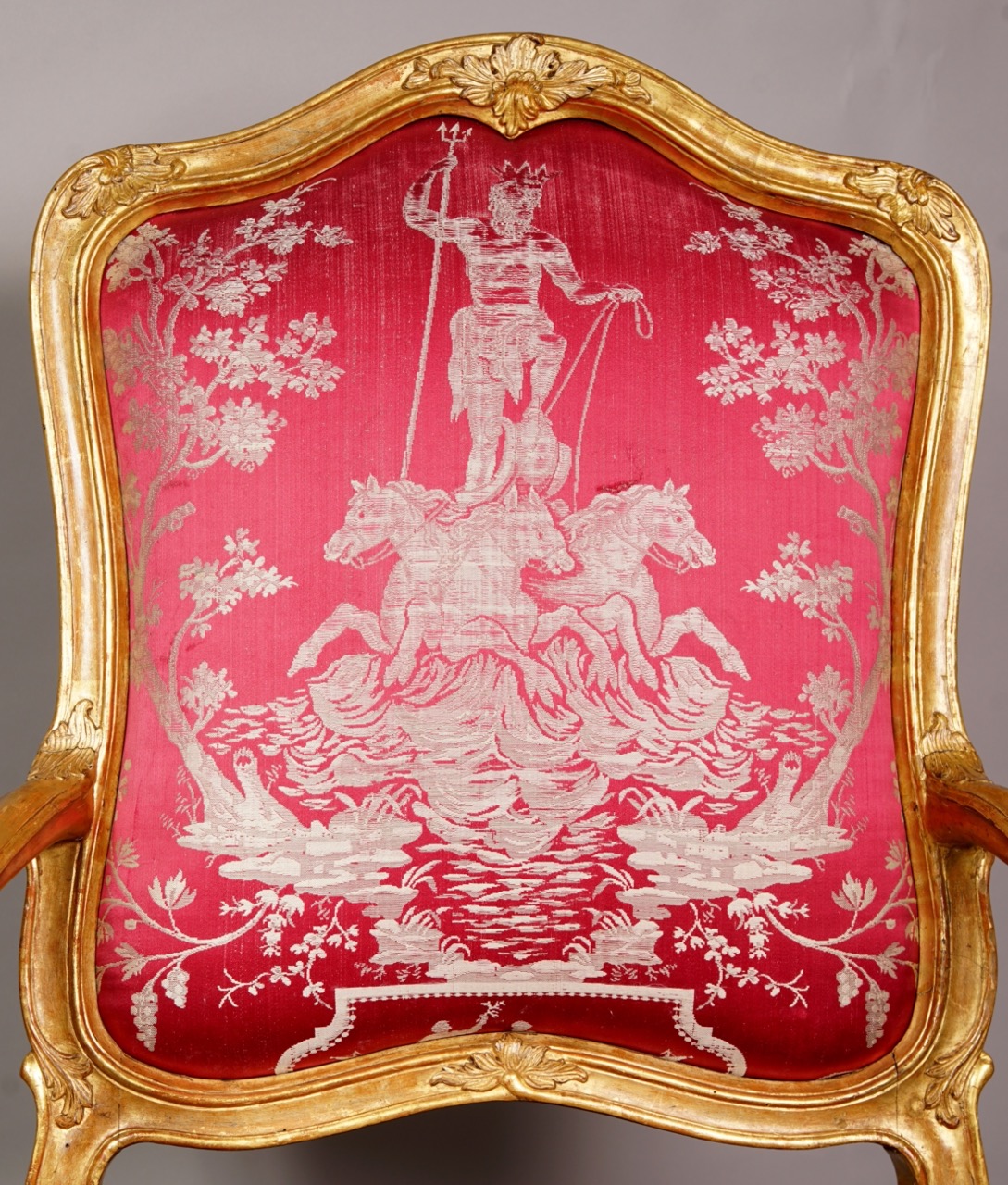 Schienale con imbottitura originale in lampasso di seta con raffigurazione di Nettuno trainato da cavalli marini