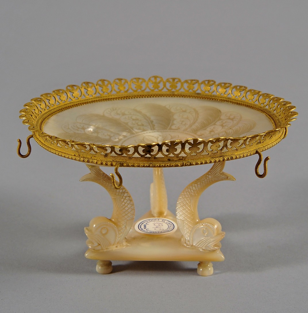 Alzata porta anelli in madreperla finemente intagliata e bronzo dorato Francia Carlo X (1820-1830 circa)