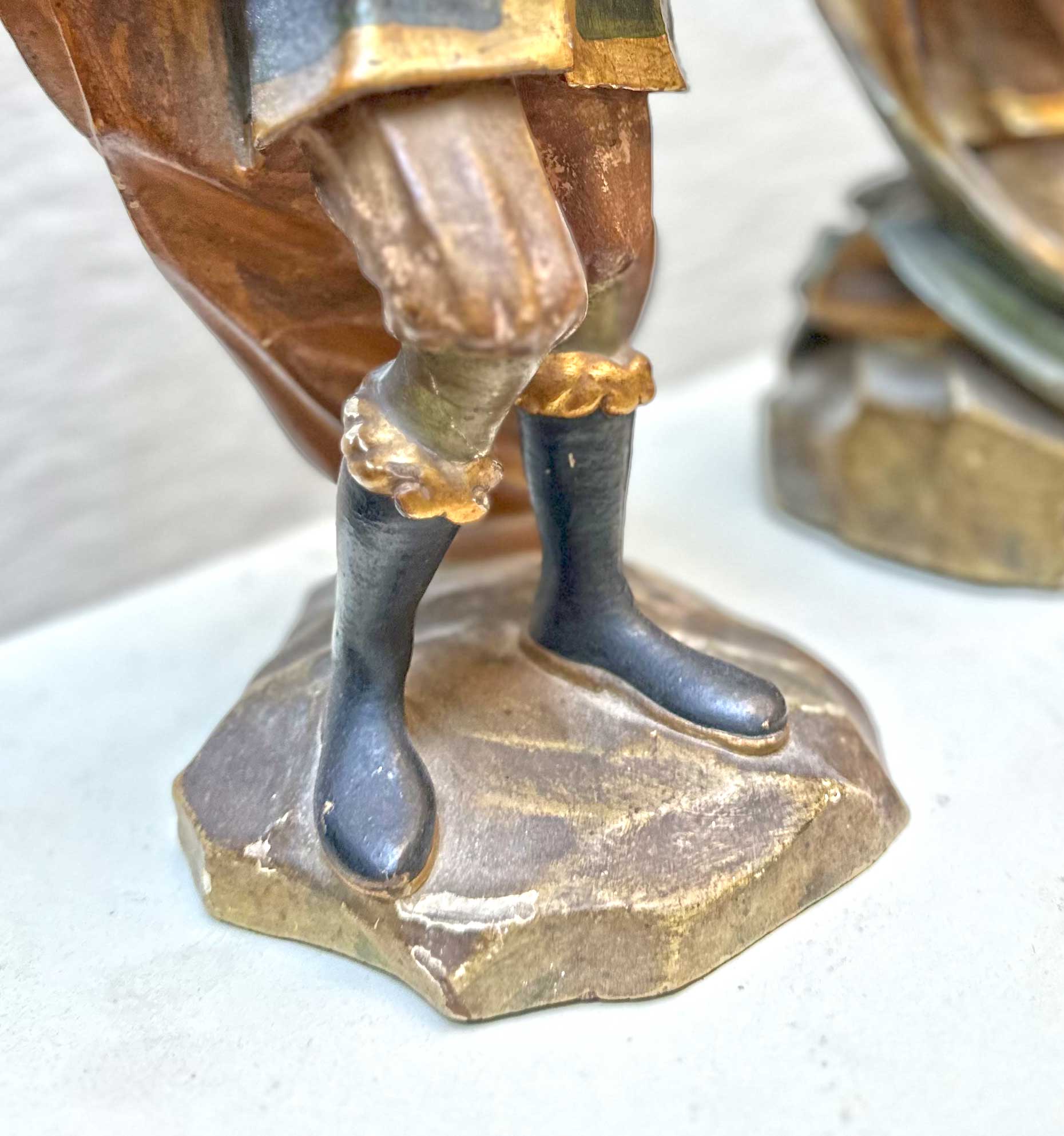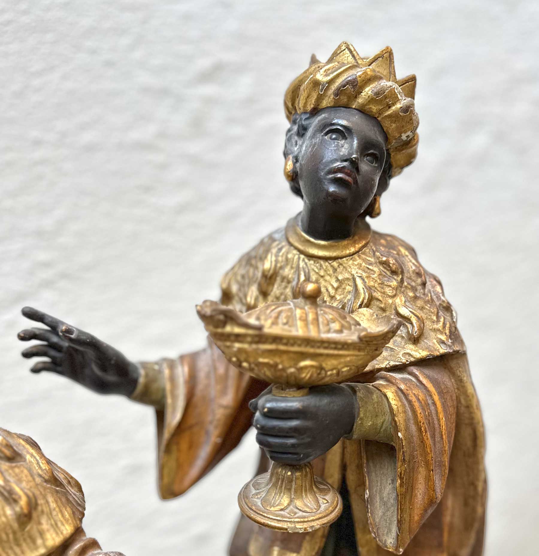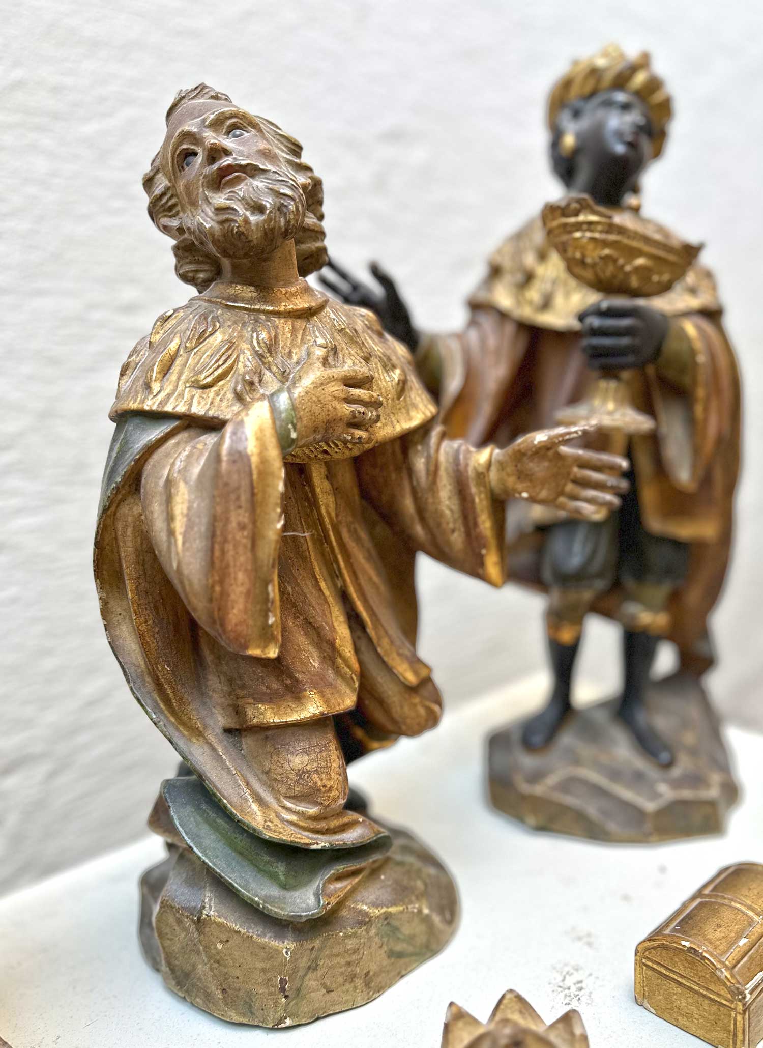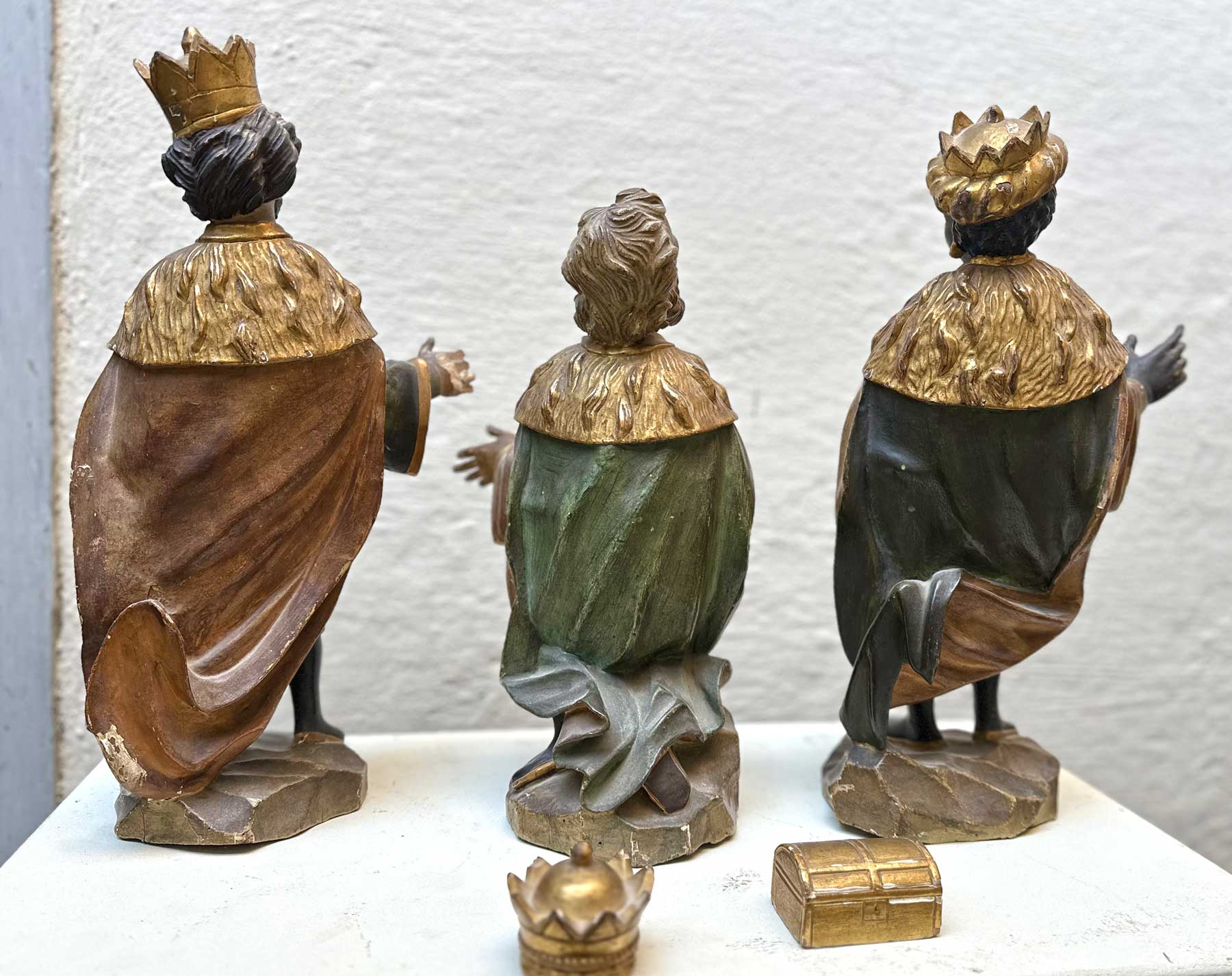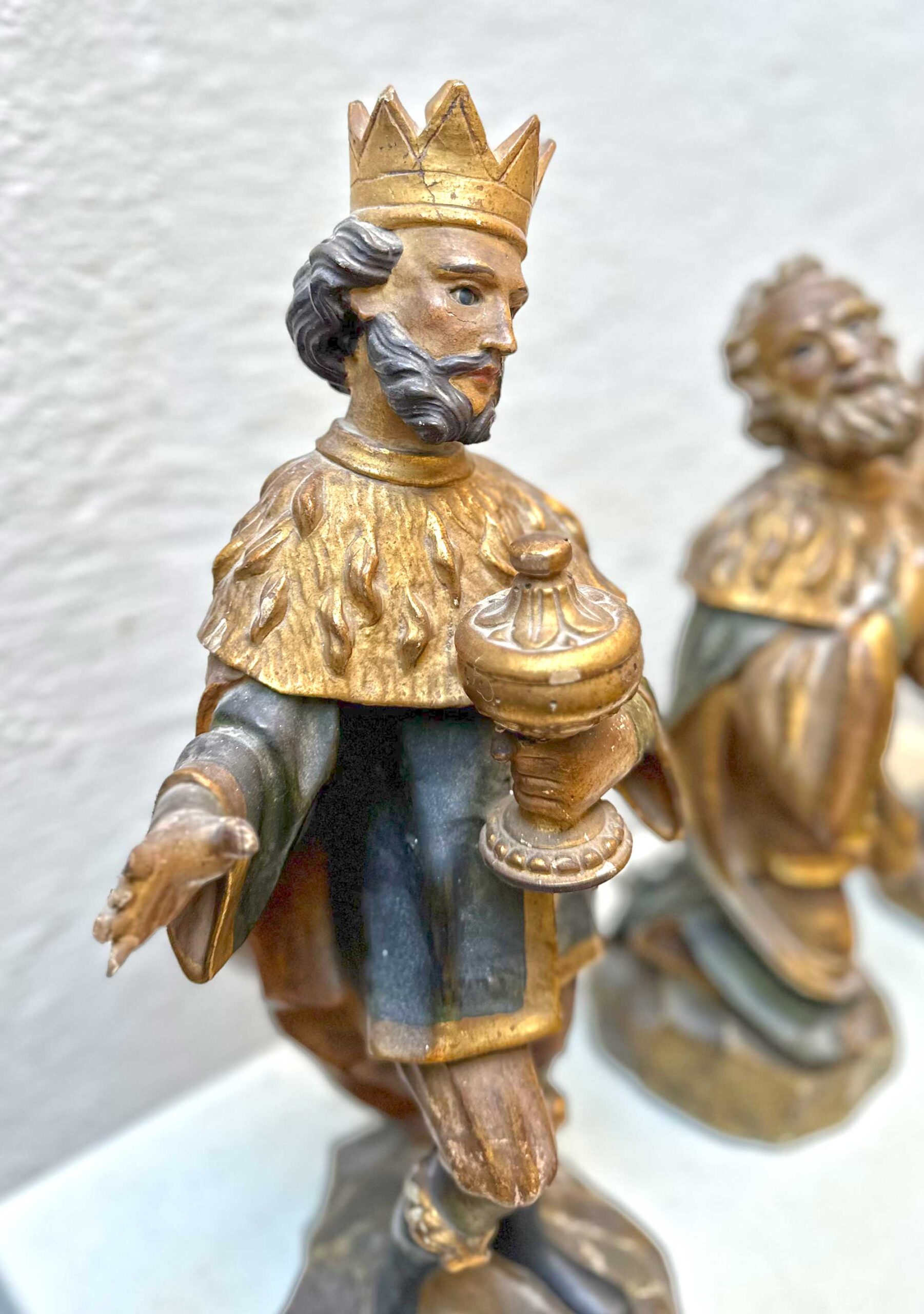 Tre sculture lignee in policromia e oro raffiguranti Re Magi, arte Veneta I metà secolo XVIII