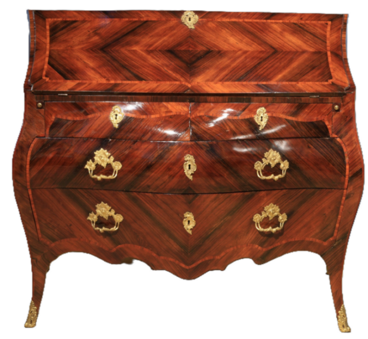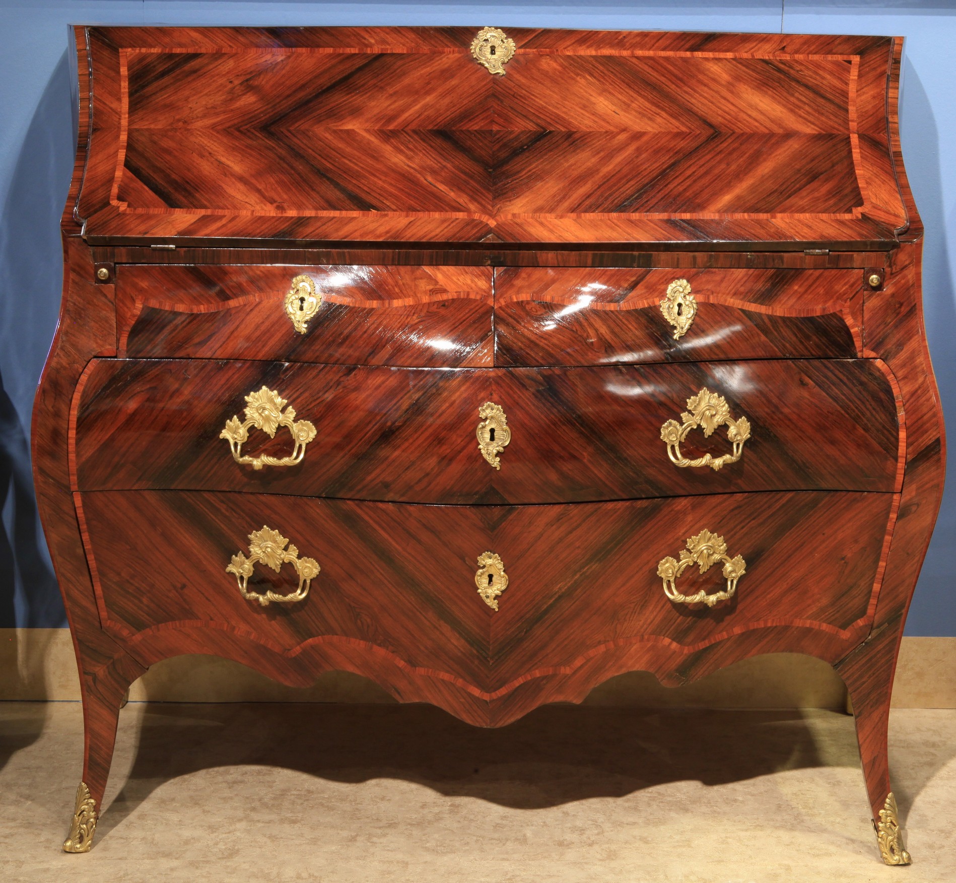 A due cassetti più due, movimentato sul fronte e sui fianchi lastronato in palissandro e filettato in bois de rose, la ribalta cela all’interno una serie di cassettinini; bronzi dorati al mercurio