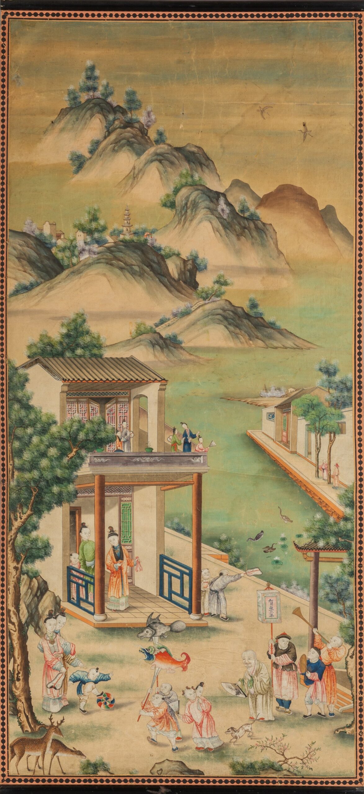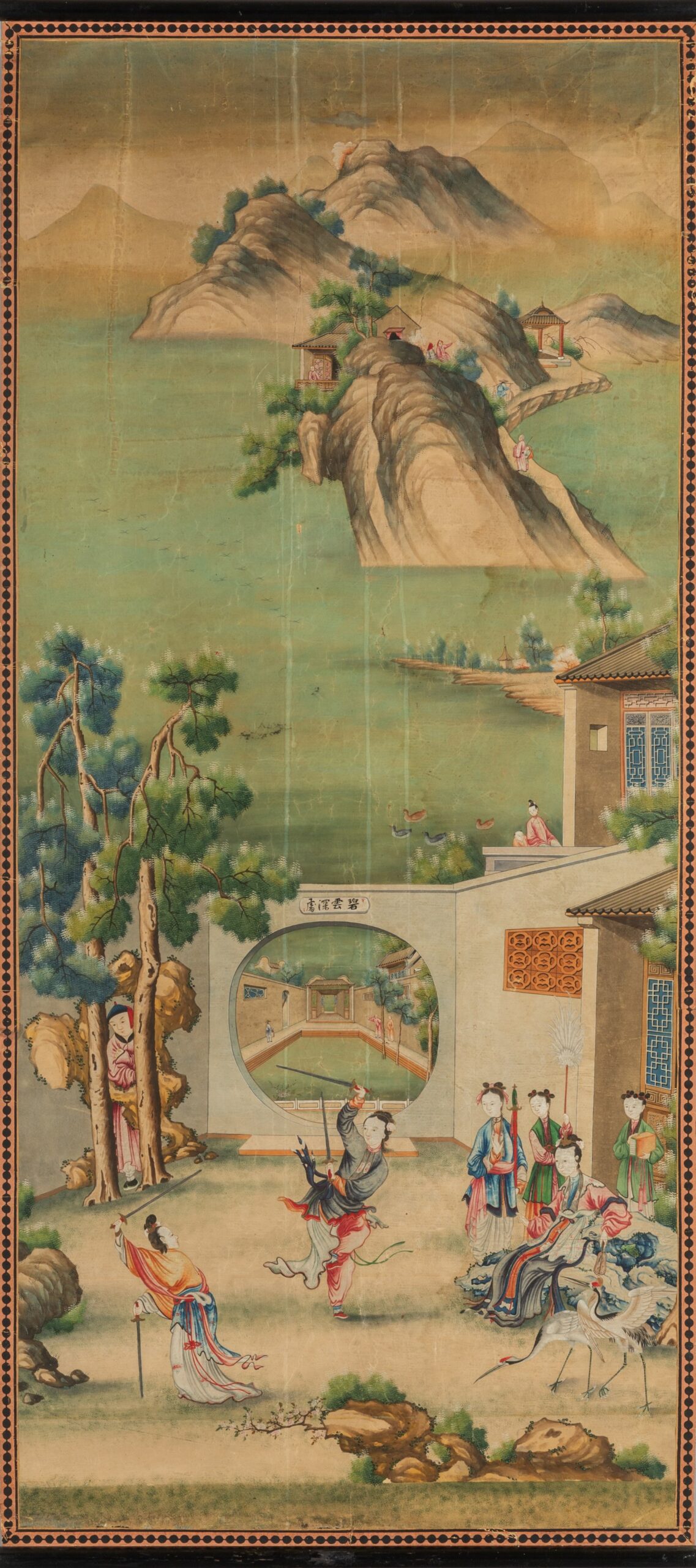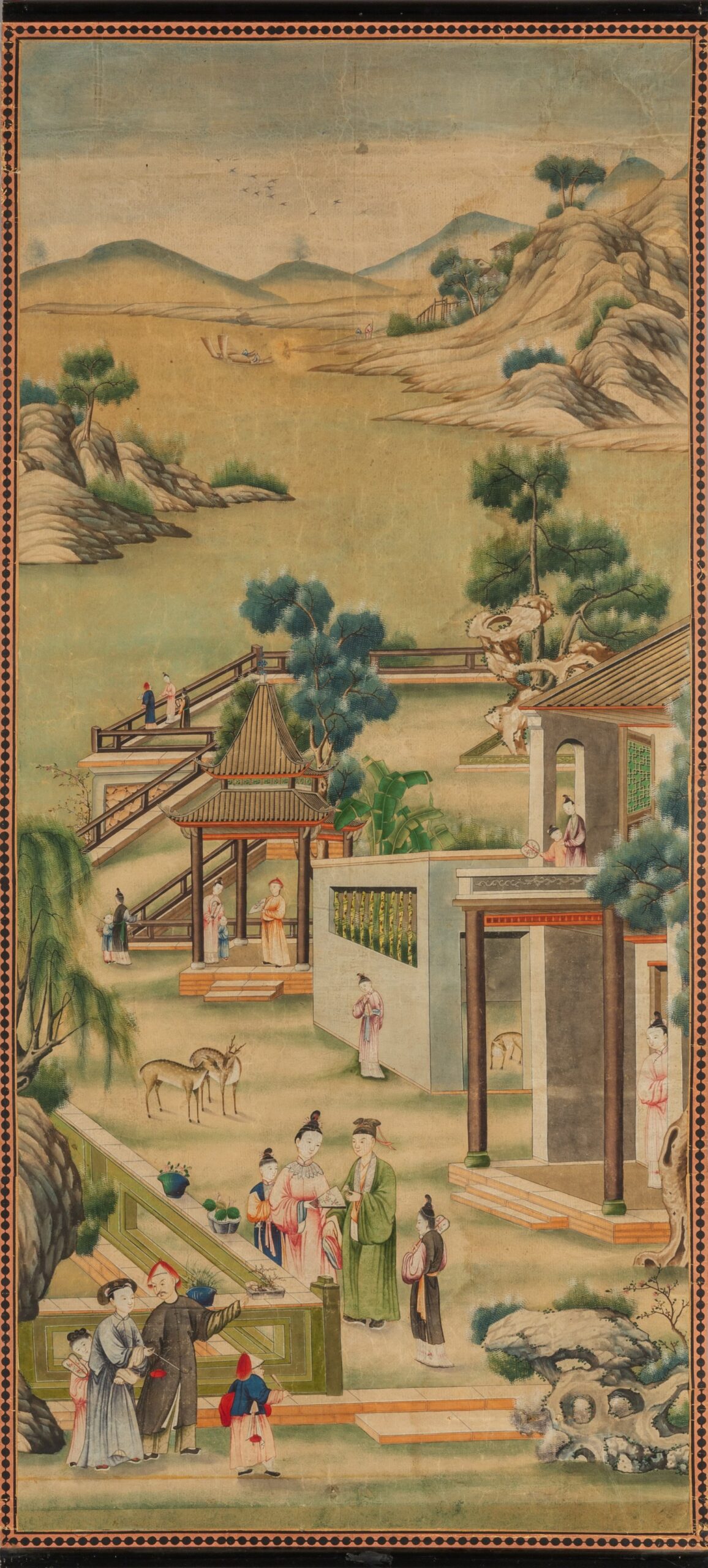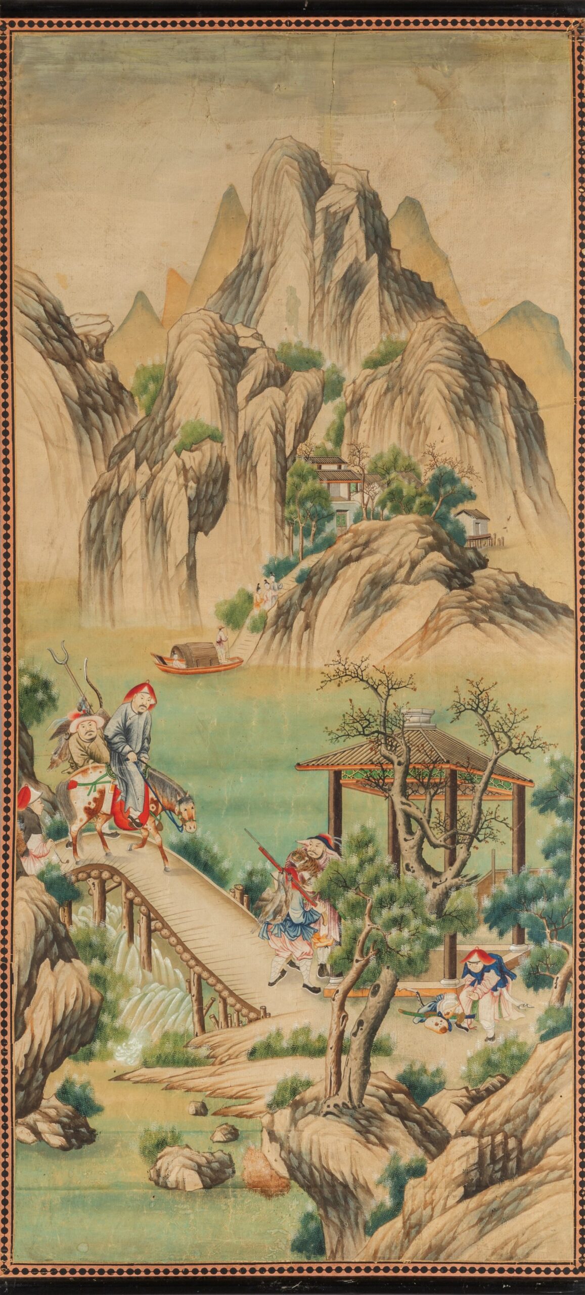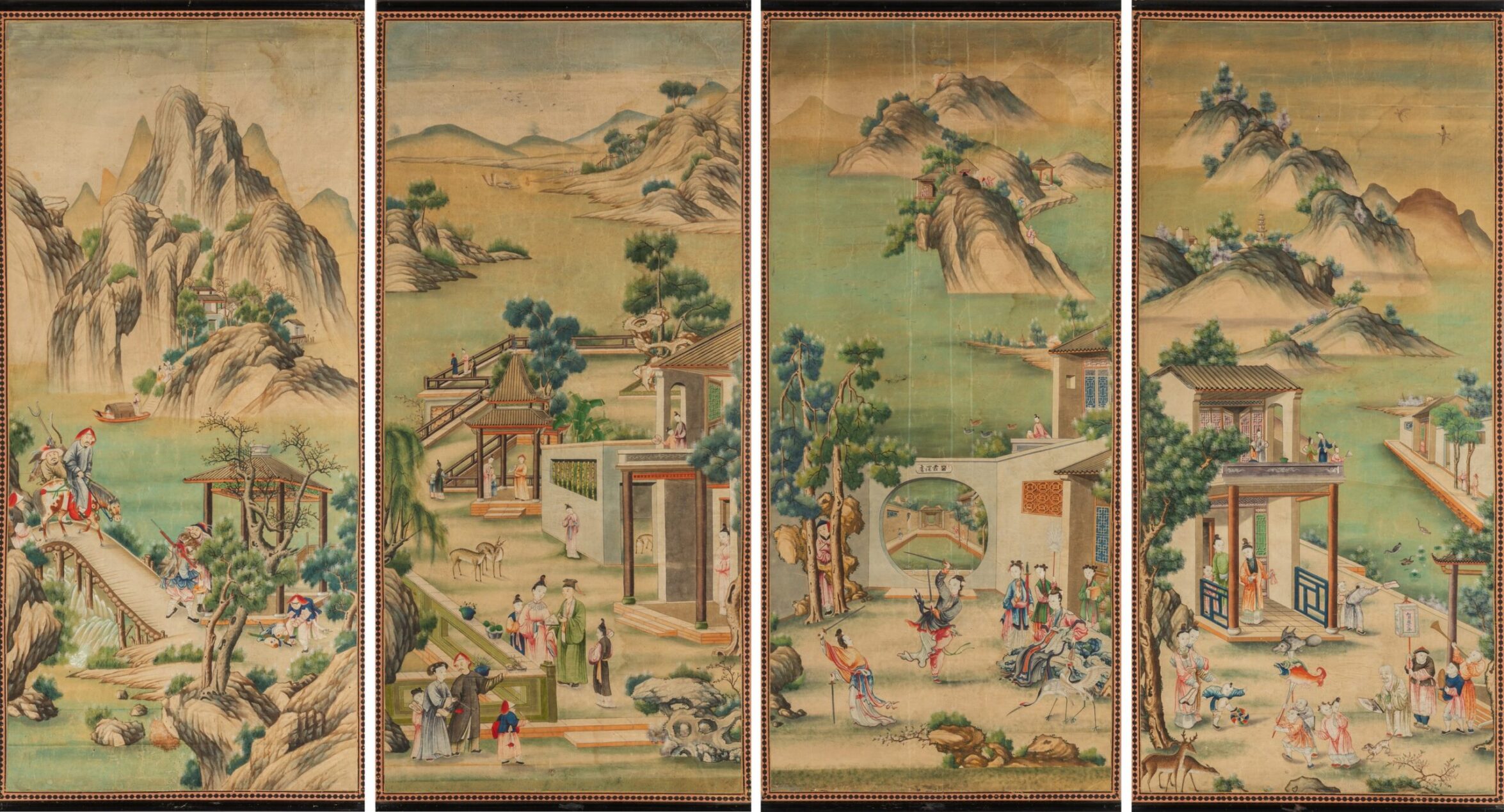 Paesaggi con scene di vita cinese, quattro rotoli dipinti su carta, Cina secolo XVIII