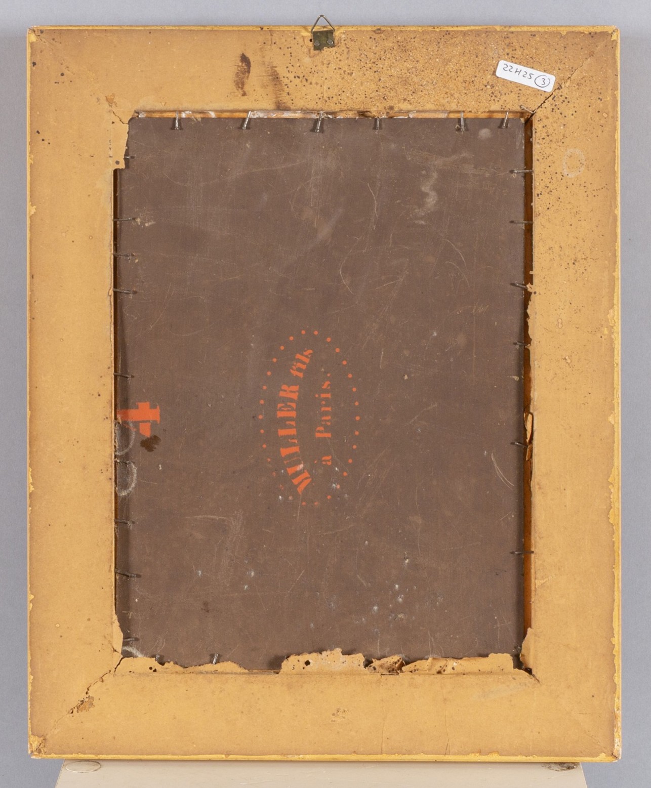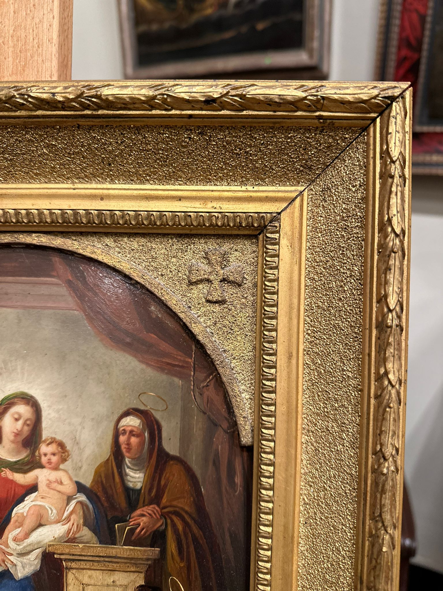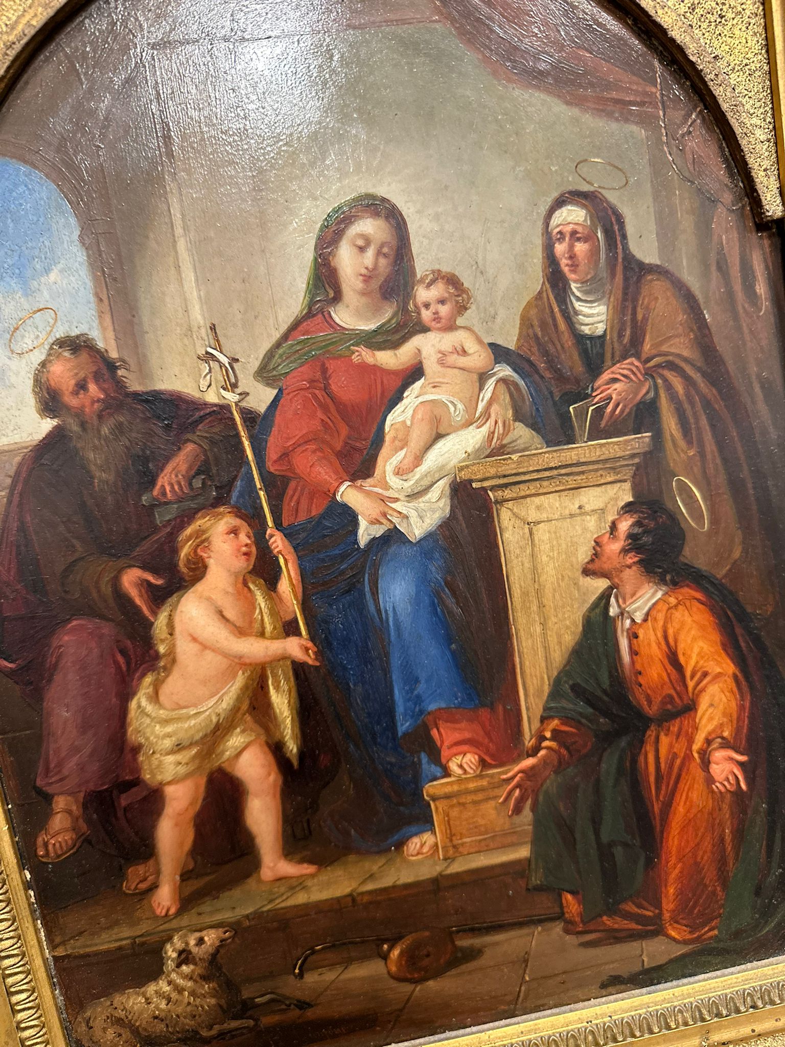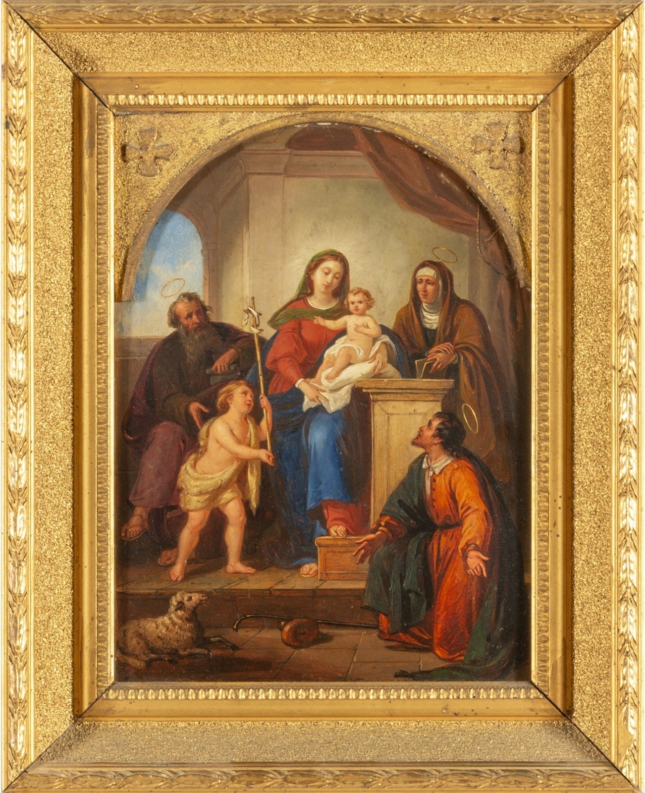 La scena è ambientata in un interno architettonico e presenta una composizione equilibrata e devozionale, con la Madonna al centro che sorregge il Bambino, affiancata da Sant’Anna e San Giuseppe; la presenza di San Giovannino e degli attributi simbolici arricchisce la narrazione sacra. La resa cromatica calda e la cura dei dettagli rimandano a modelli della tradizione pittorica italiana ottocentesca.