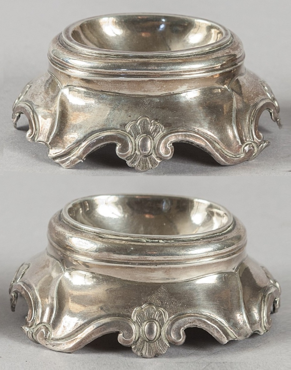le saliere presentano una lavorazione di alta qualità con decorazioni a rilievo, rappresentative dell’arte argentiera del XVIII secolo. La provenienza e il punzone attestano l’autenticità e il valore storico dell’oggetto