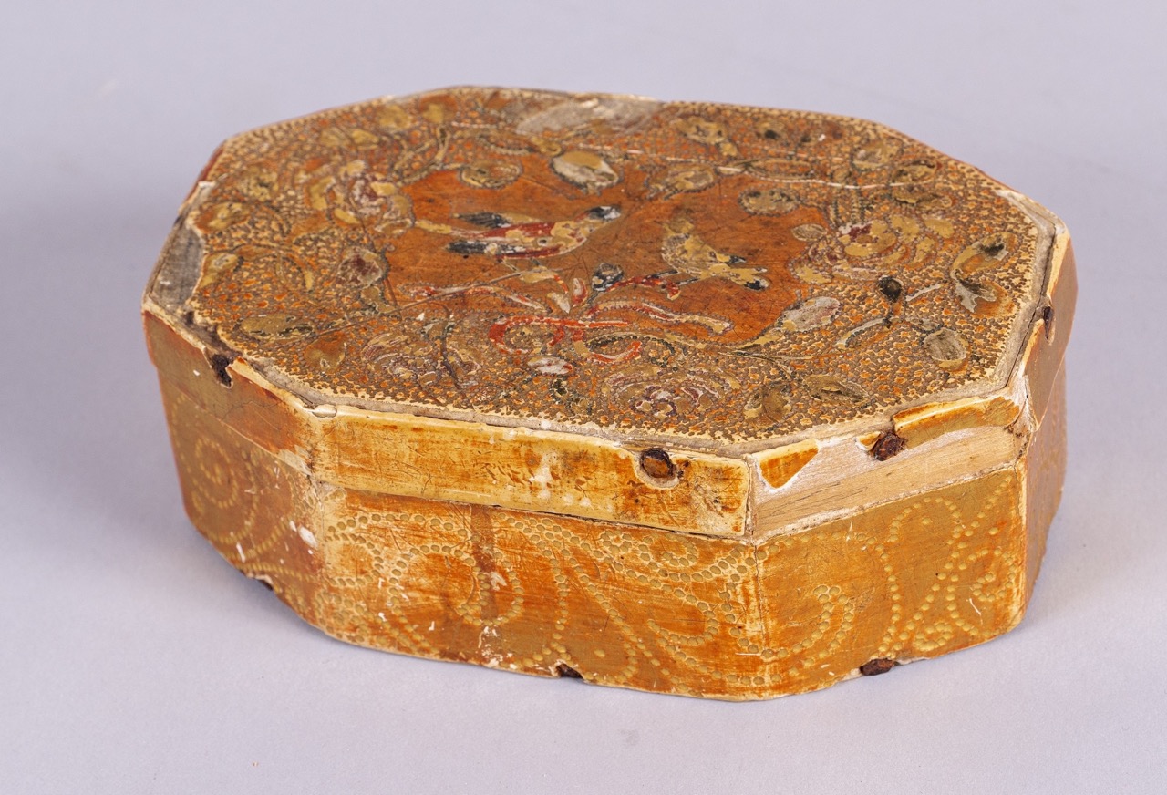 Scatola delle suore ottagonale in legno dorato a tempera su fondo blu, Toscana secolo XVI