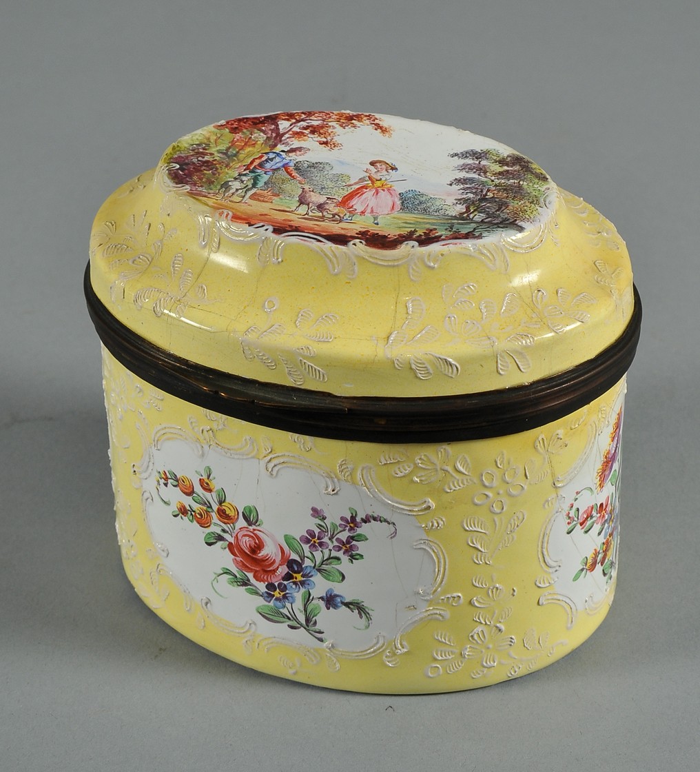 Il coperchio bombato è decorato con una scena pastorale raffigurante una coppia e il loro cane in un paesaggio alberato, mentre i lati presentano motivi floreali in rilievo e delicati decori dipinti. Un bordo scuro separa con raffinatezza il coperchio dalla base.